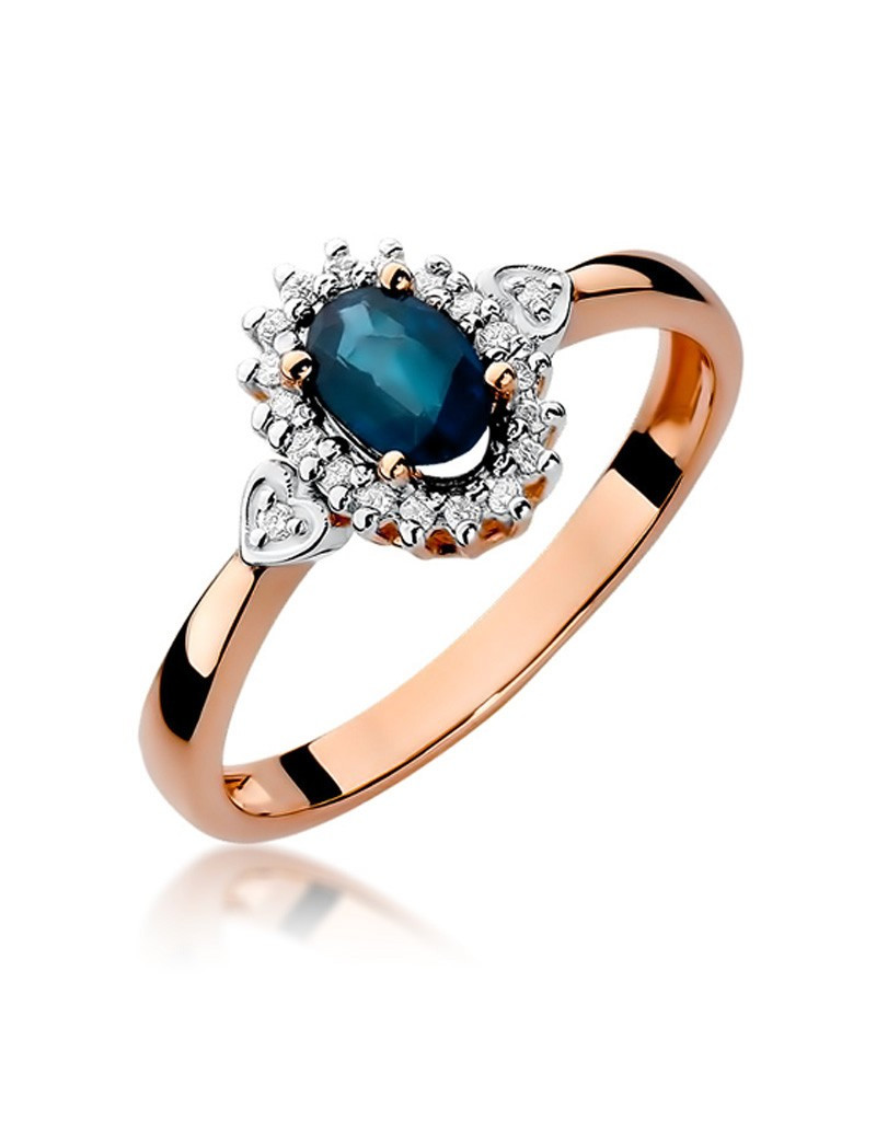 Ponadczasowy wzór złotego pierścionka z unikatowym szafirem w krystalicznej oprawie z 20 brylantami, oraz 2 subtelnymi serduszkami.