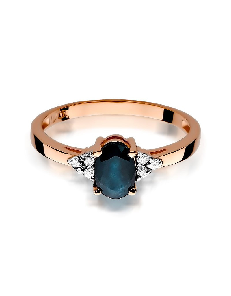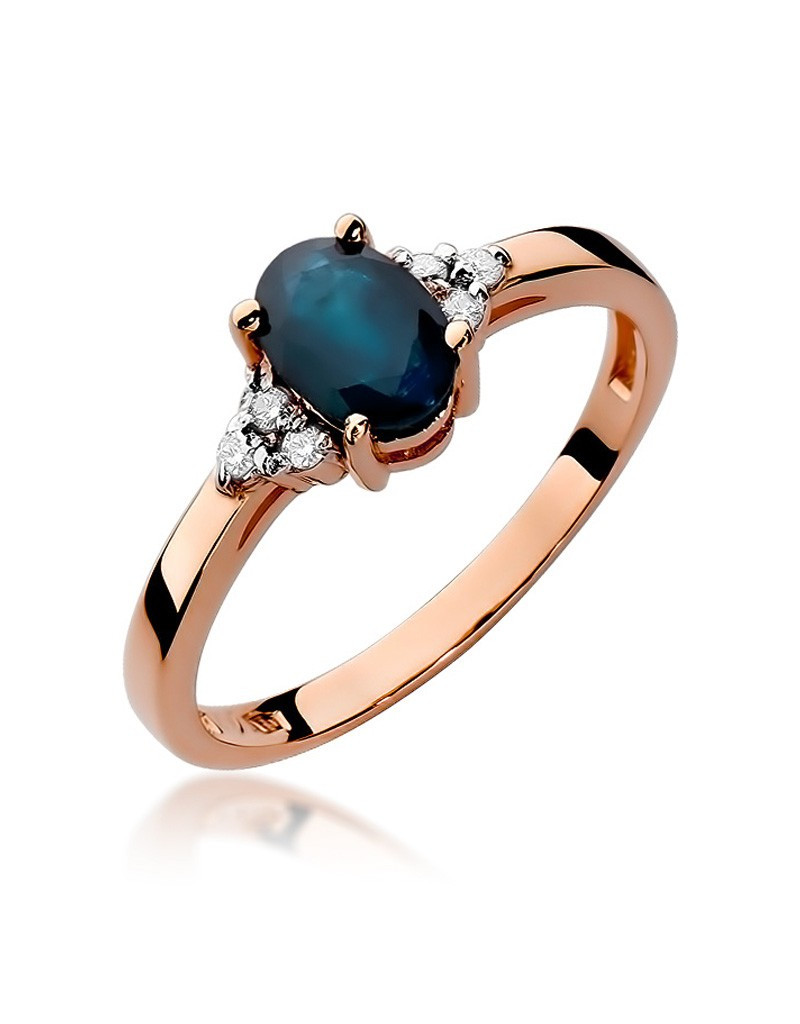Luksusowy pierścionek z różowego złota z owalnym szafirem w wyjątkowej oprawie z 6 brylantami.