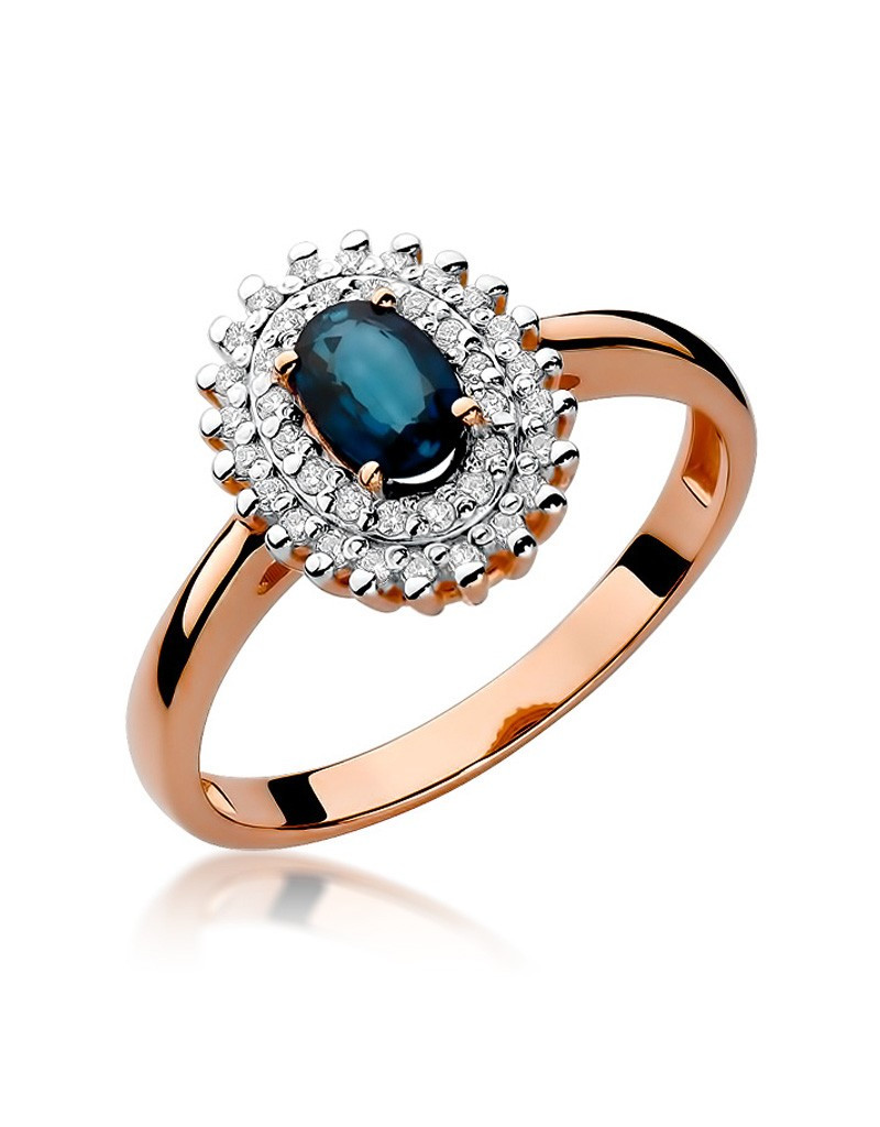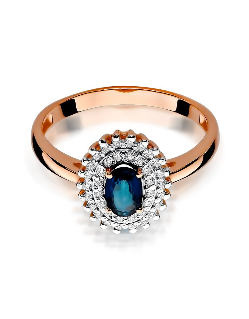 Ponadczasowy pierścionek z różowego złota z fascynującym szafirem otoczonym 39 lśniącymi brylantami.