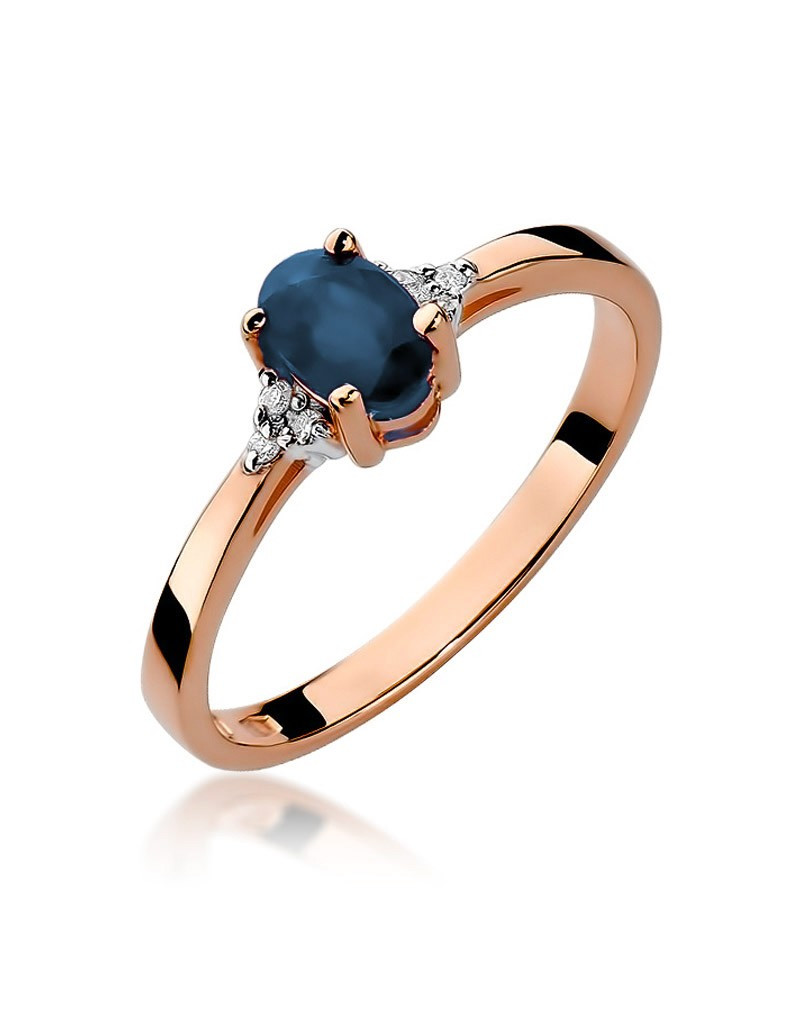 Urzekający pierścionek wykonany z różowego złota z przepięknym szafirem, oraz brylantami które dodają mu blasku.