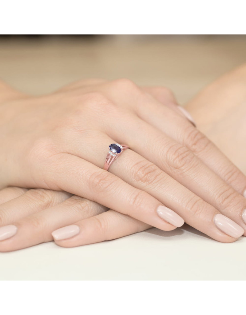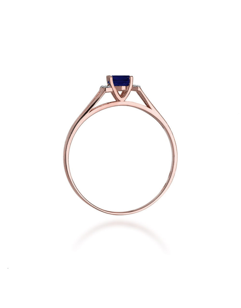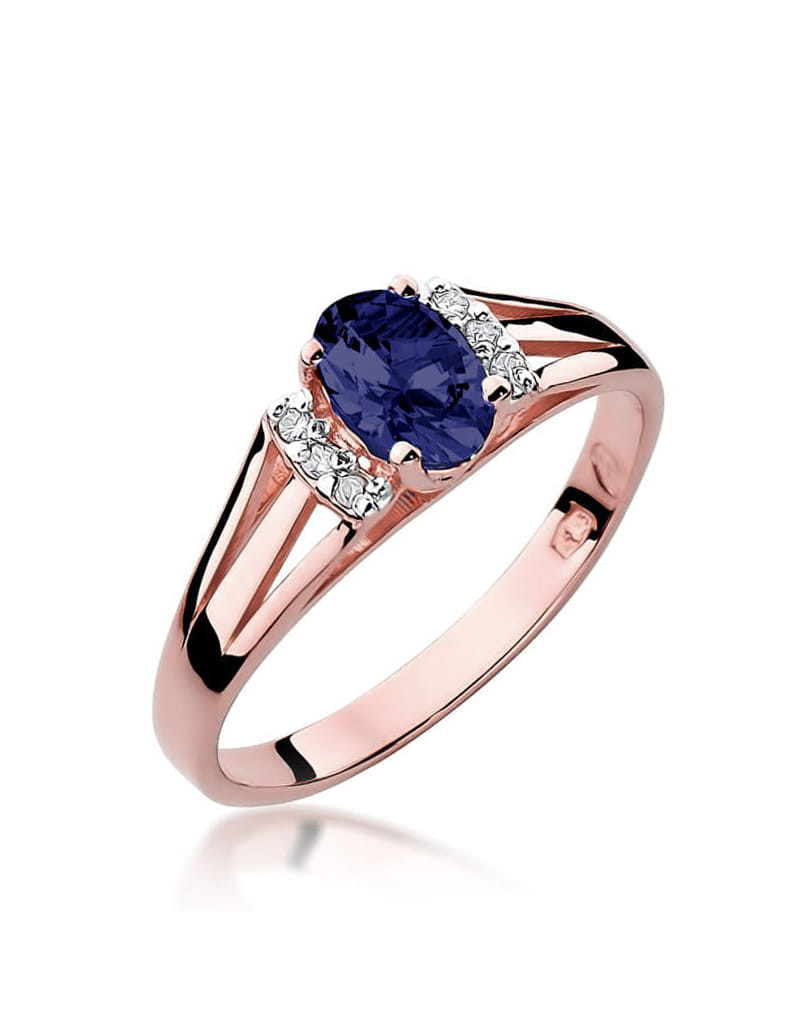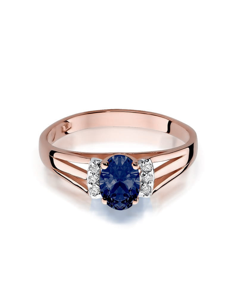 Doskonały wzór pierścionka z sześcioma brylantami, oraz niezwykłym owalnym szafirem. Wykonany z różowego złota.