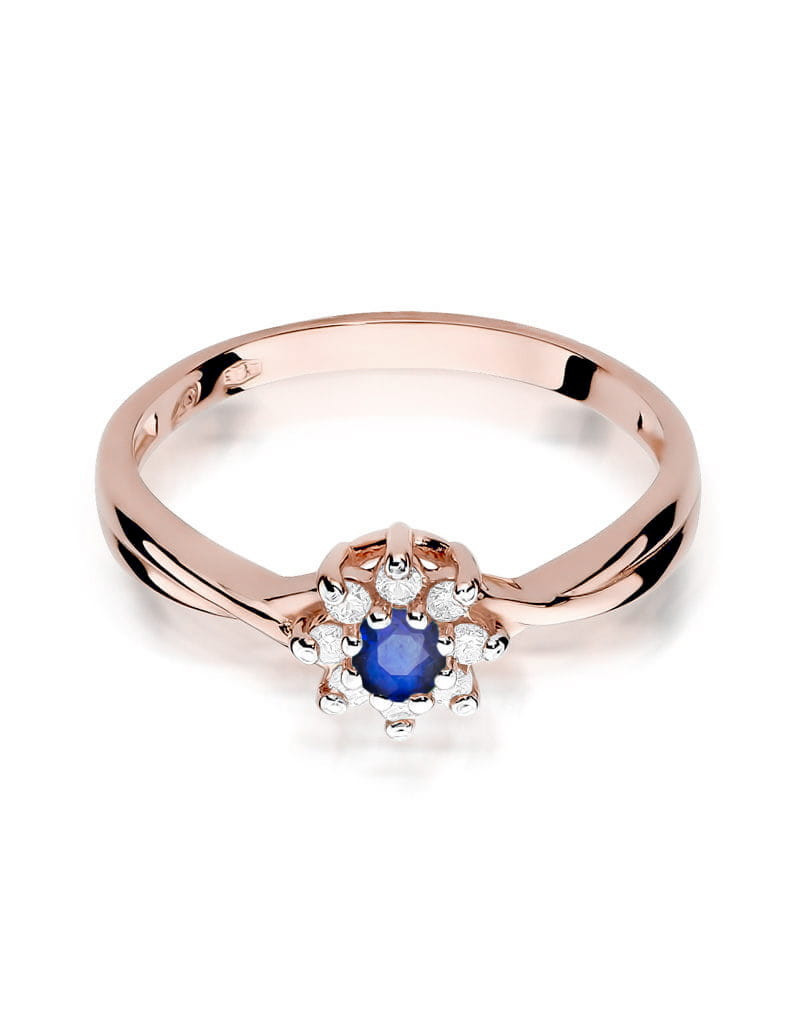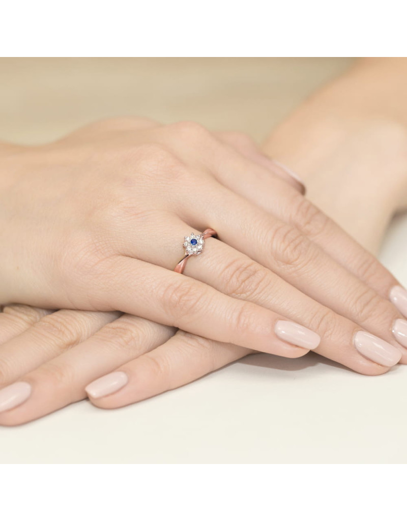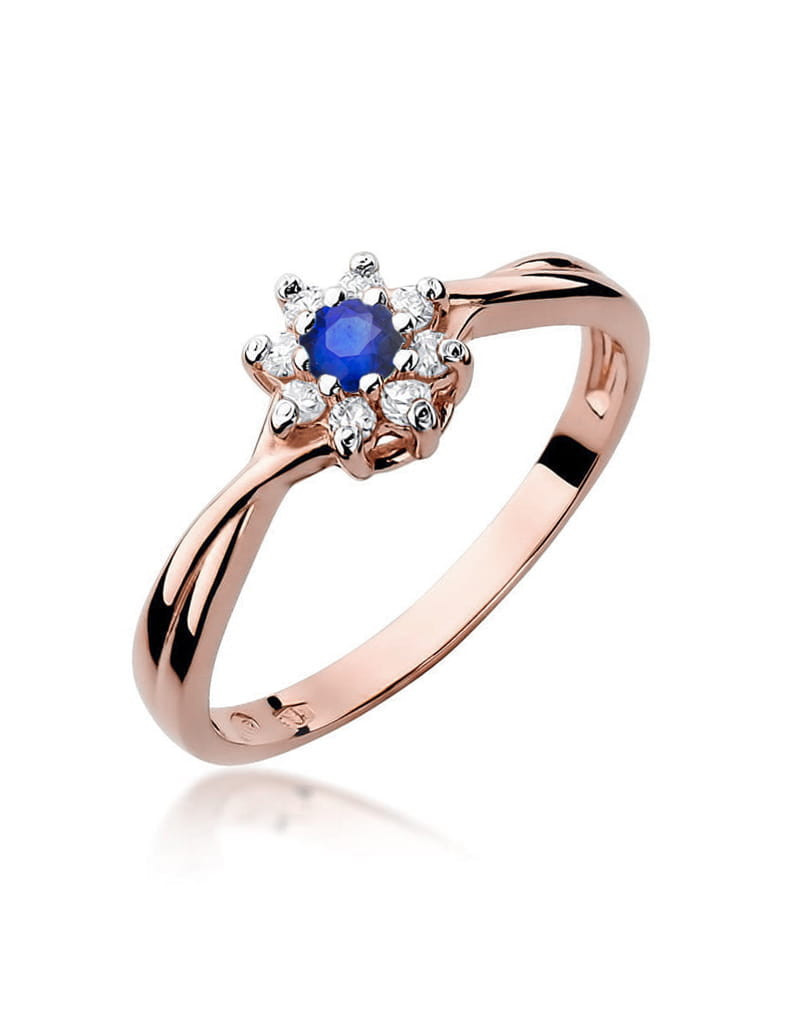 Pełen uroku pierścionek z różowego złota ze szlachetnym szafirem i lśniącymi brylantami w formie kwiatuszka.