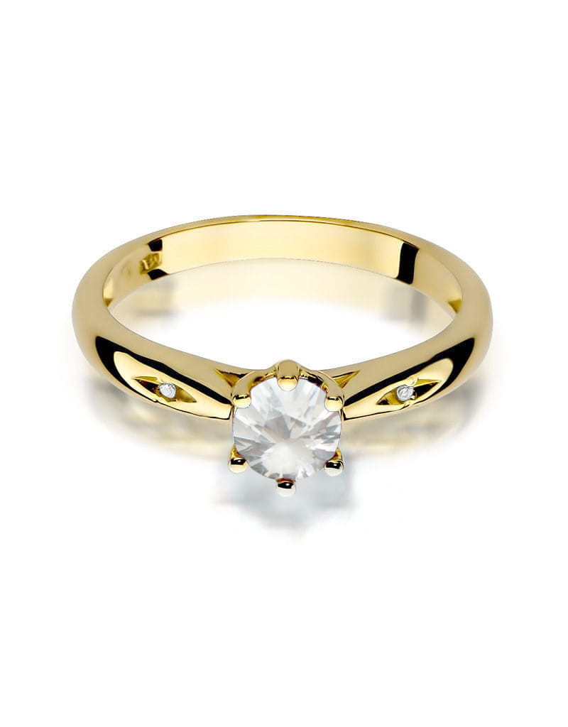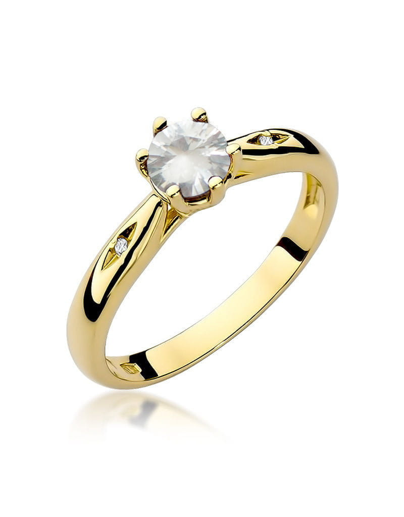 Wyjątkowy złoty pierścionek z urodziwym białym szafirem i brylantami w atrakcyjnej oprawie.