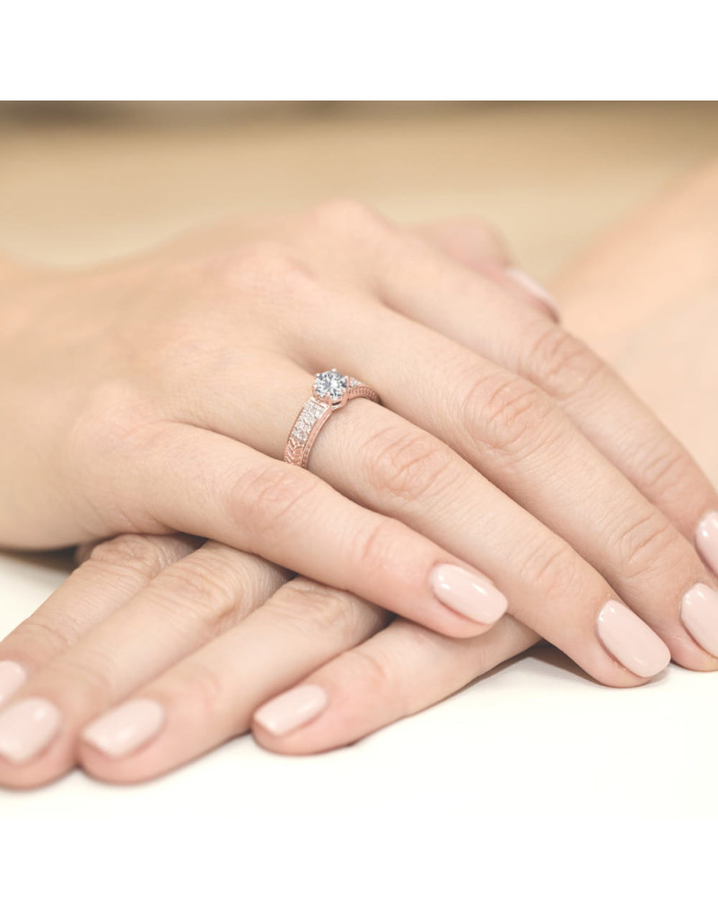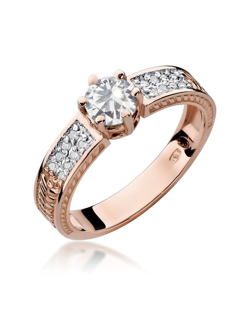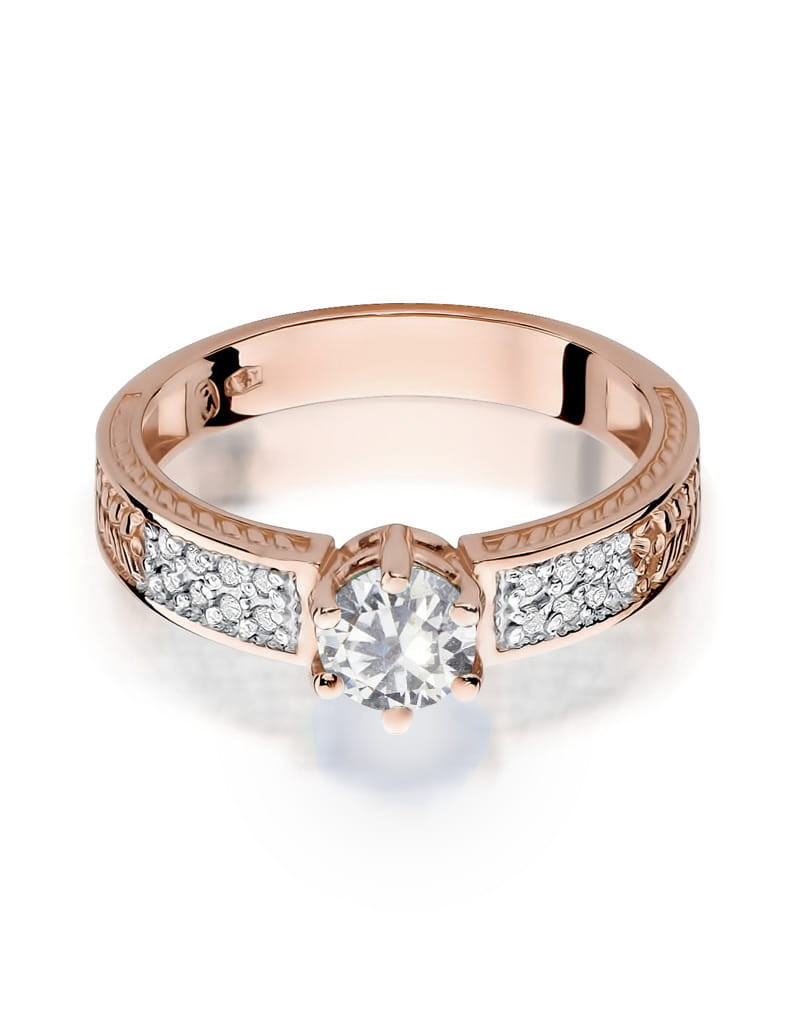 Ponadczasowy pierścionek z różowego złota z przepięknym szafirem i lśniącymi brylantami na szynie, które dodają mu blasku.