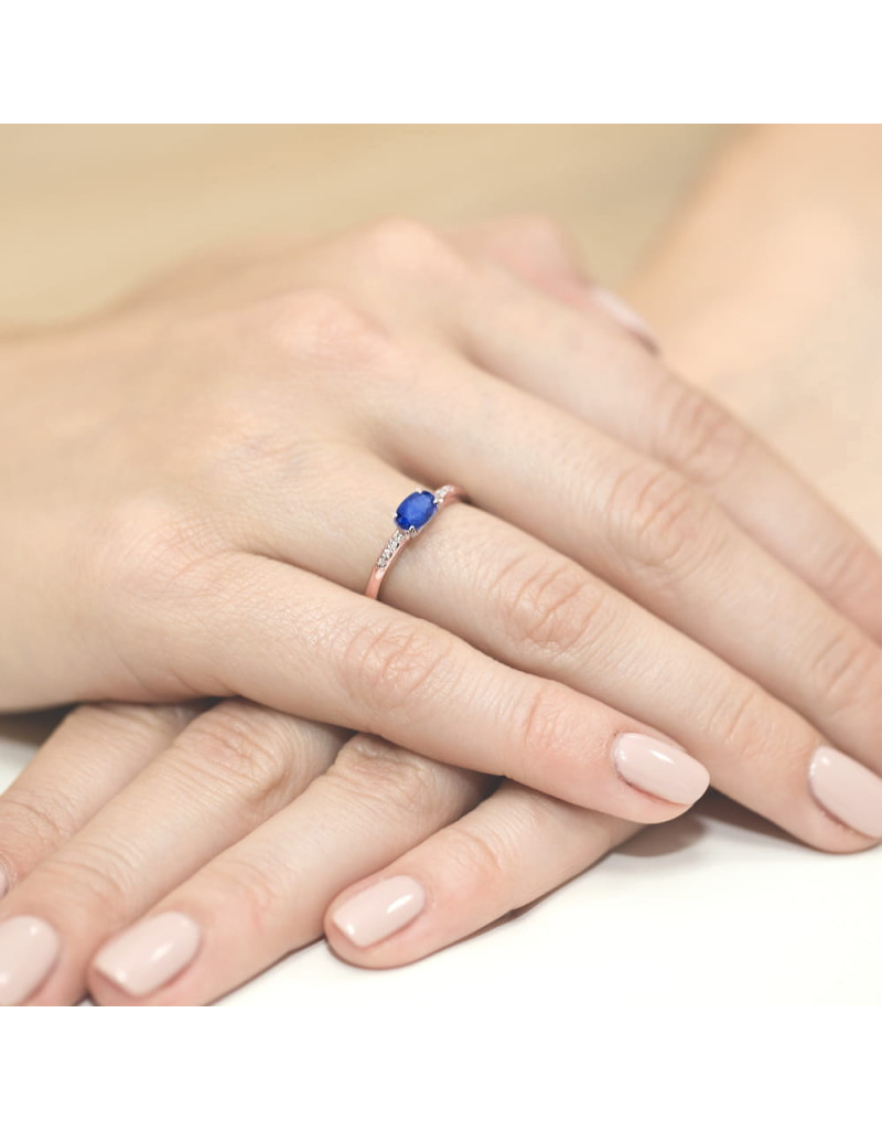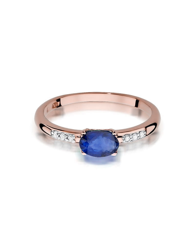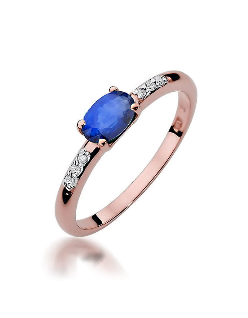 Bajeczny pierścionek wykonany z różowego złota z przepięknym szafirem oraz lśniącymi brylantami w eleganckiej oprawie.