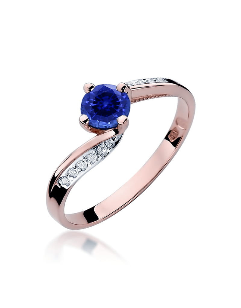 Pełen wdzięku pierścionek z różowego złota z urokliwym szafirem i brylantami osadzonymi w białym złocie w finezyjnej oprawie.