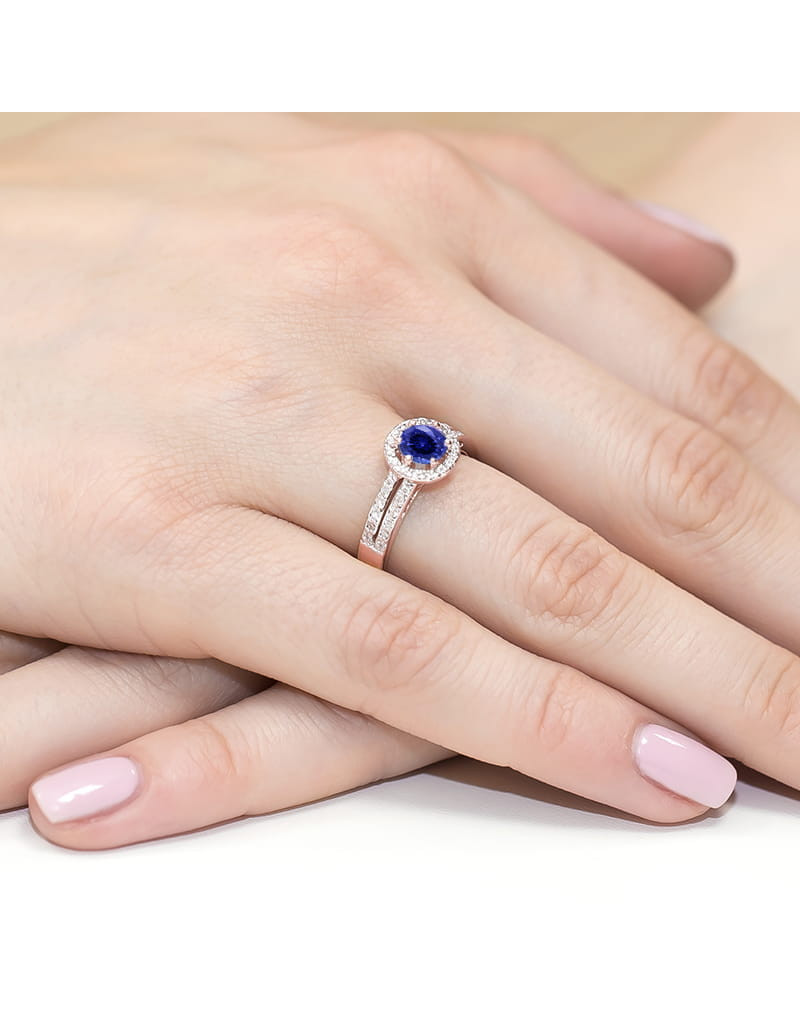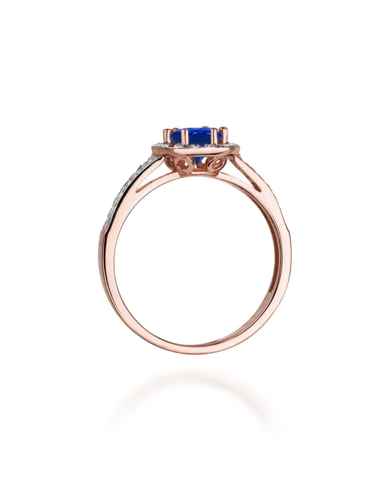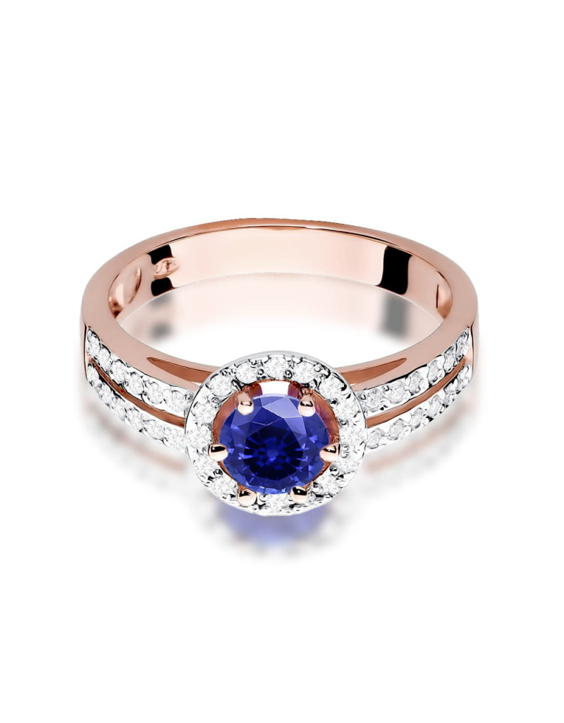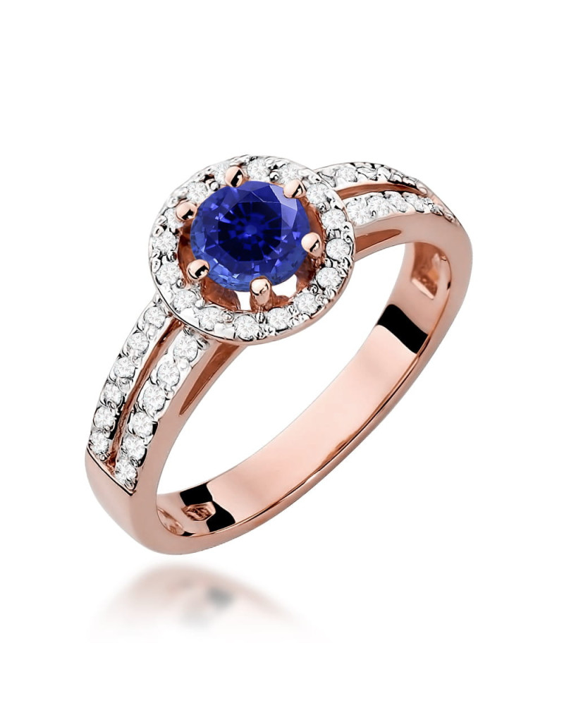 Luksusowy złoty pierścionek z okrągłym szafirem i 40 brylantami które pięknie go rozświetlają.