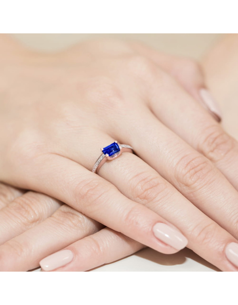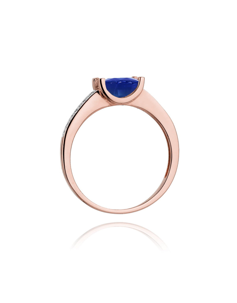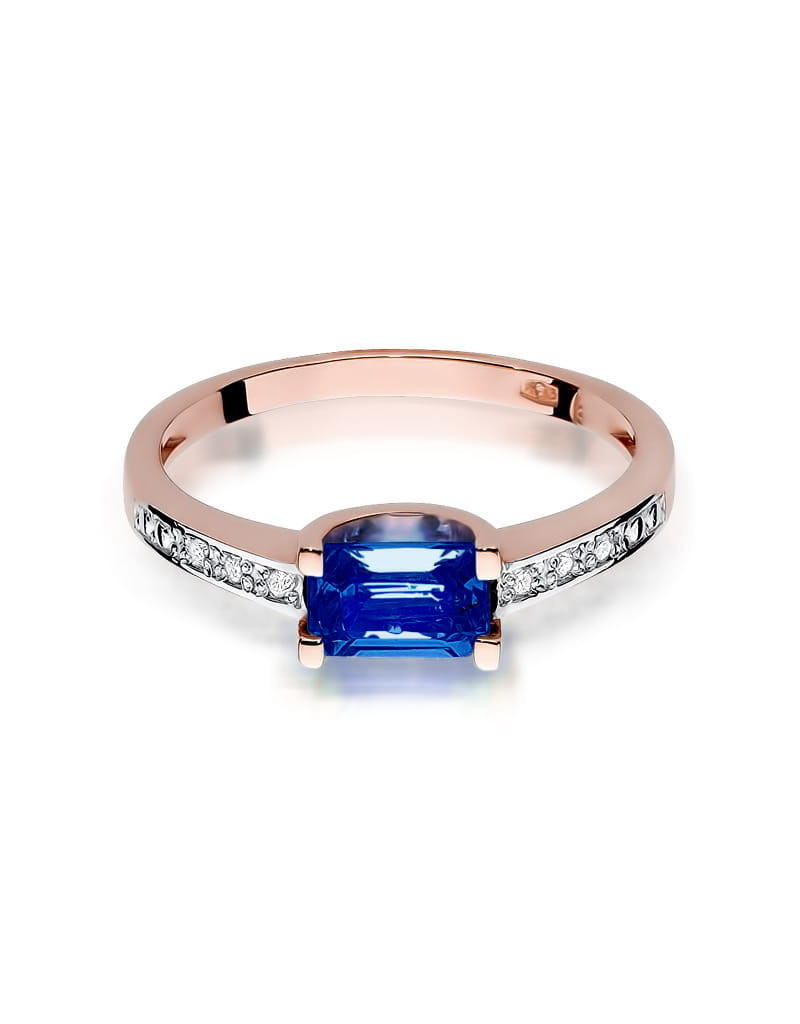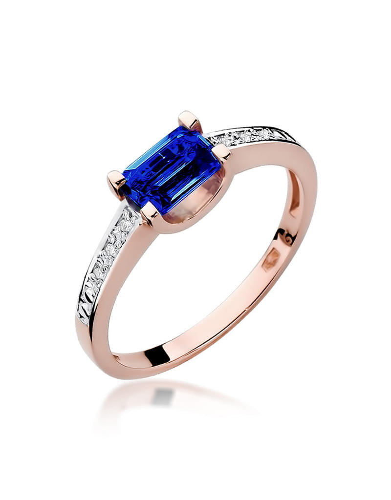 Oryginalny złoty pierścionek z niebiańskim szafirem oraz brylantami, które dodają mu blasku.
