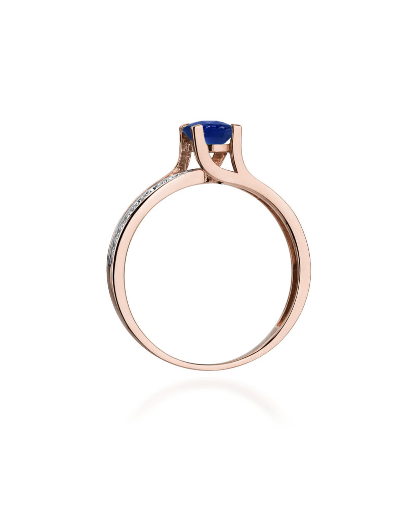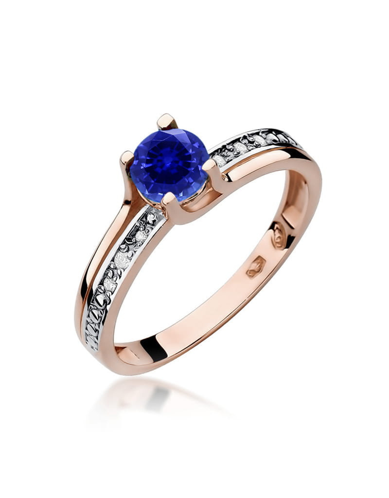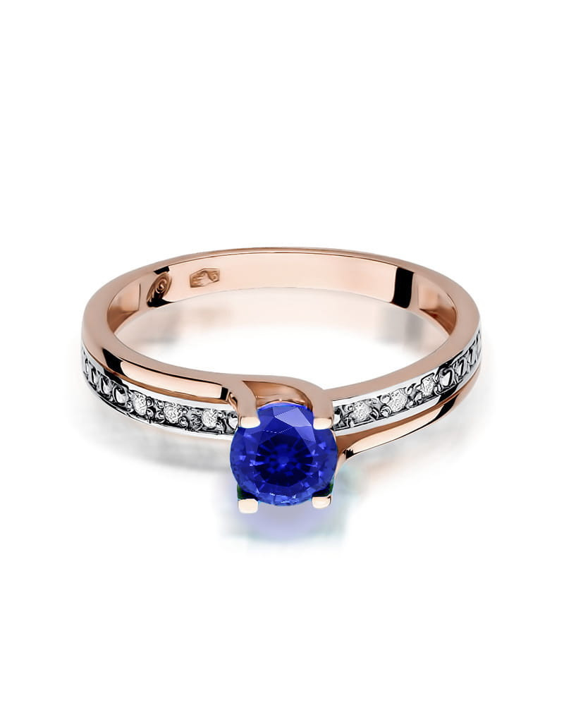 Fantazyjny pierścionek z okrągłym szafirem w czteroramiennej koronie, oraz dwukolorową szyną ozdobioną brylantami.