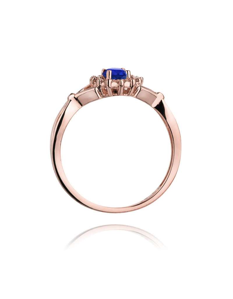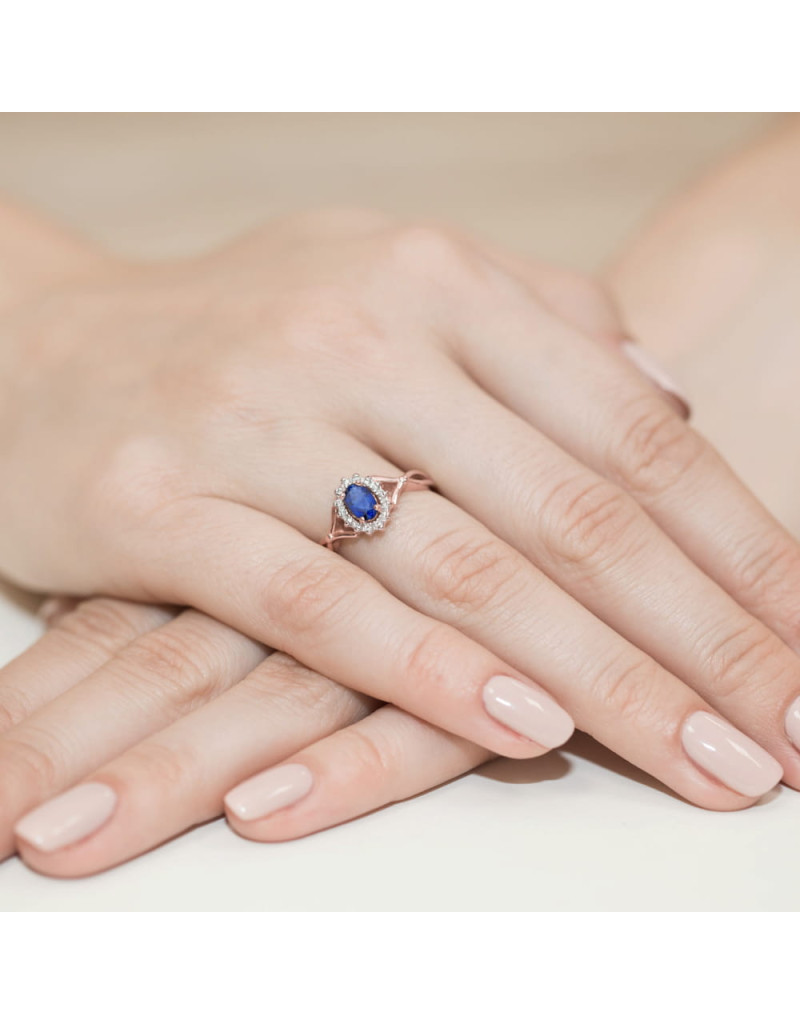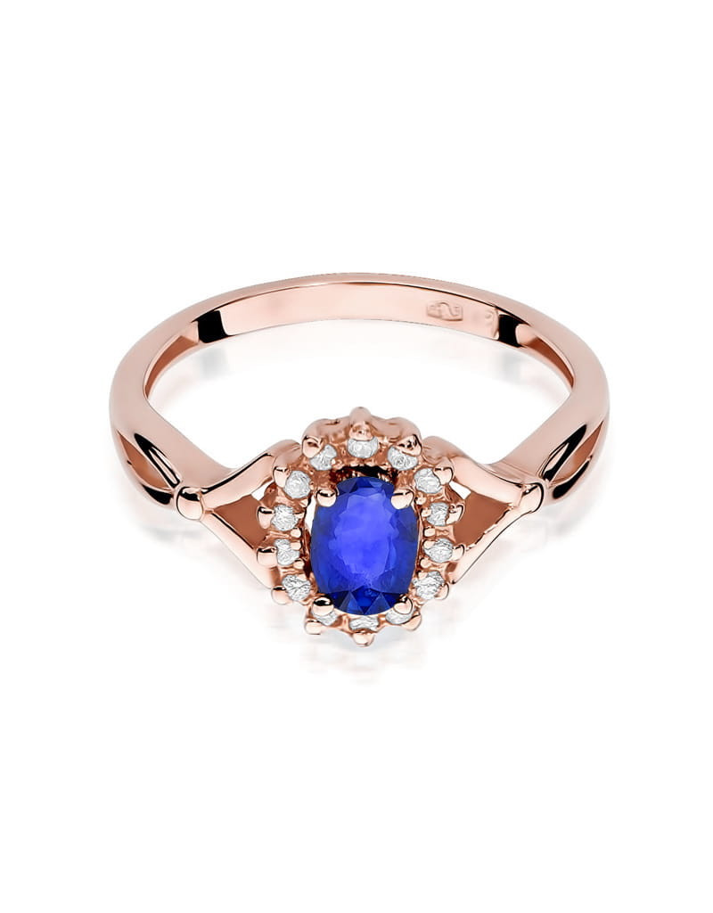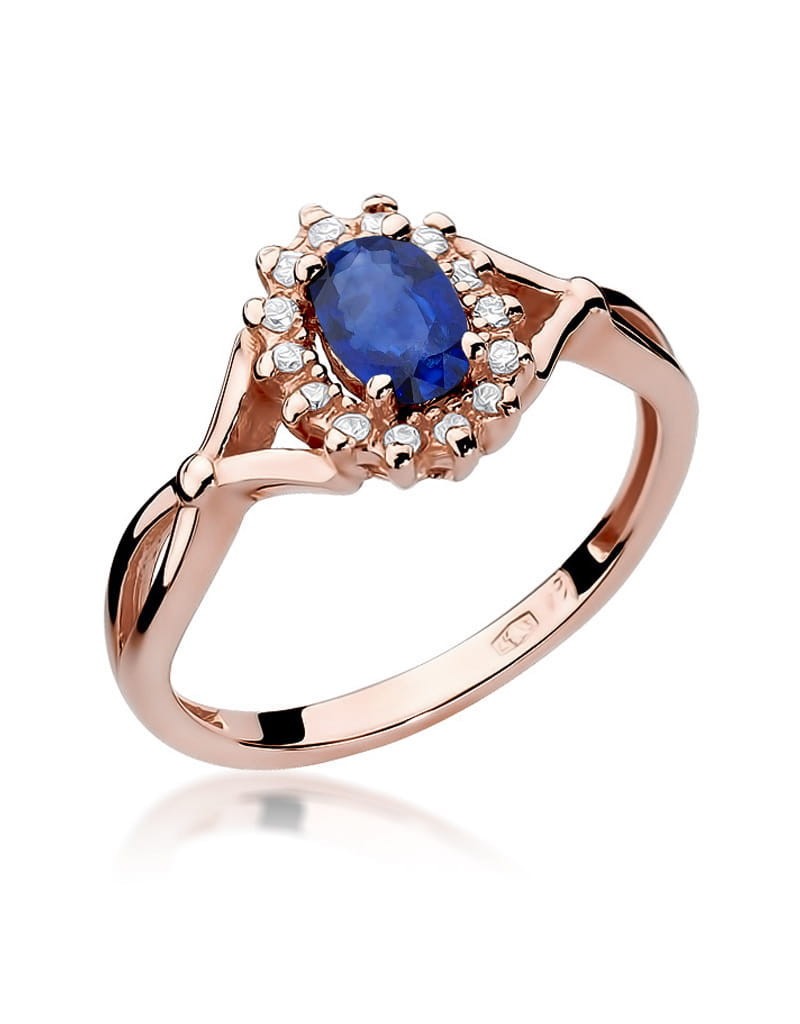 Godny podziwu pierścionek z różowego złota z 14 brylantami dookoła zachwycającego szafiru.