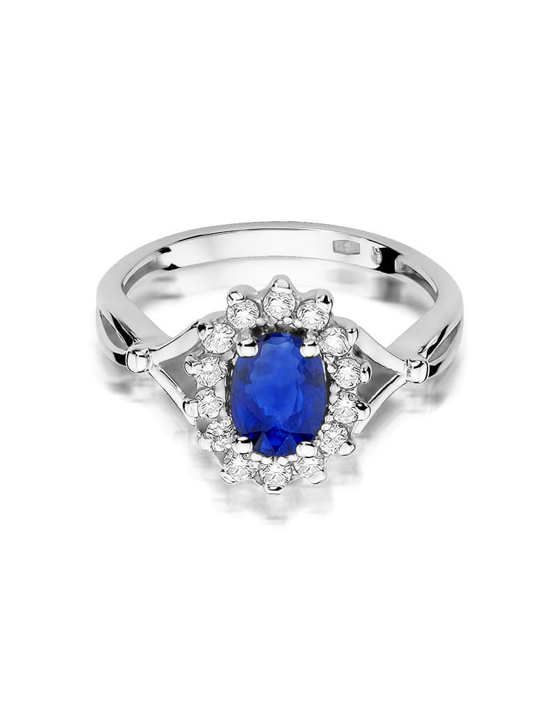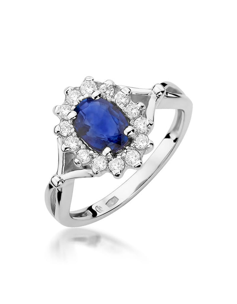 Godny podziwu pierścionek z białego złota z 14 brylantami dookoła zachwycającego szafiru.