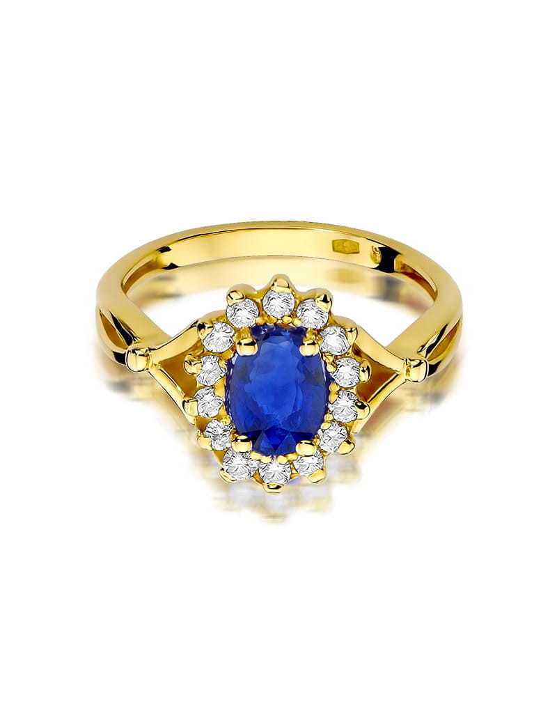 Godny podziwu pierścionek z żółtego złota z 14 brylantami dookoła zachwycającego szafiru.