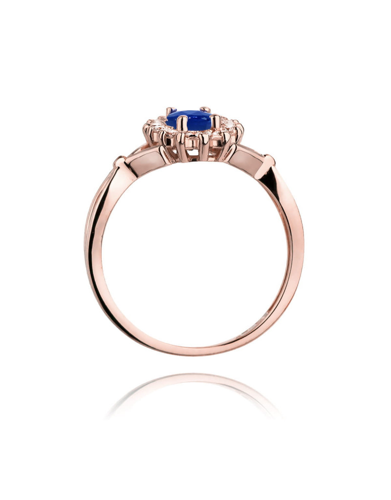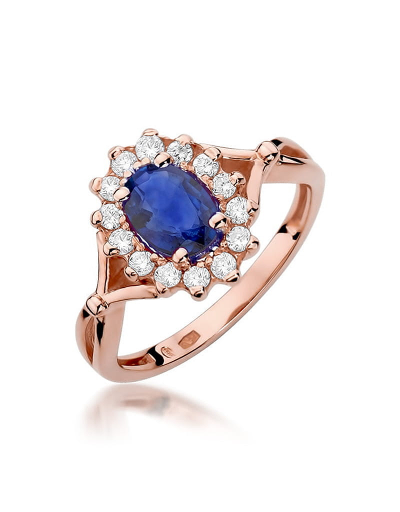 Godny podziwu pierścionek z różowego złota z 14 brylantami dookoła zachwycającego szafiru.
