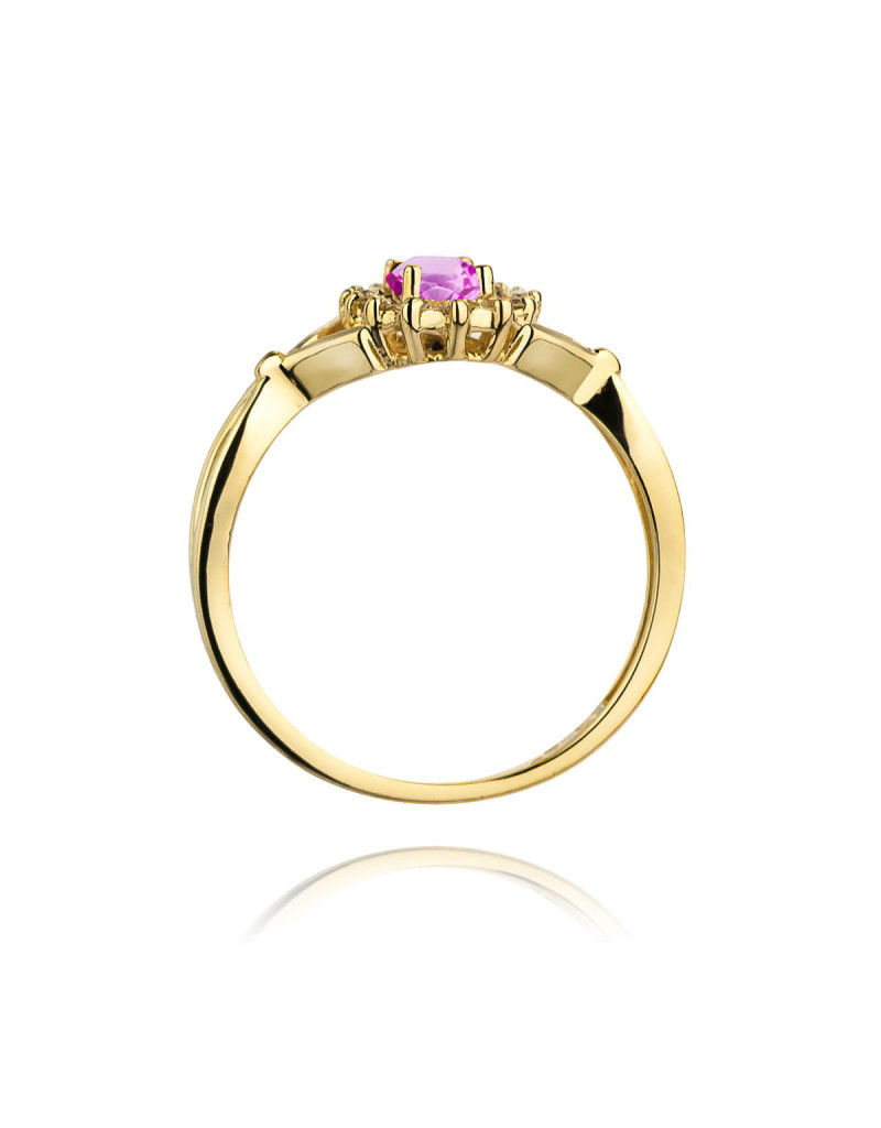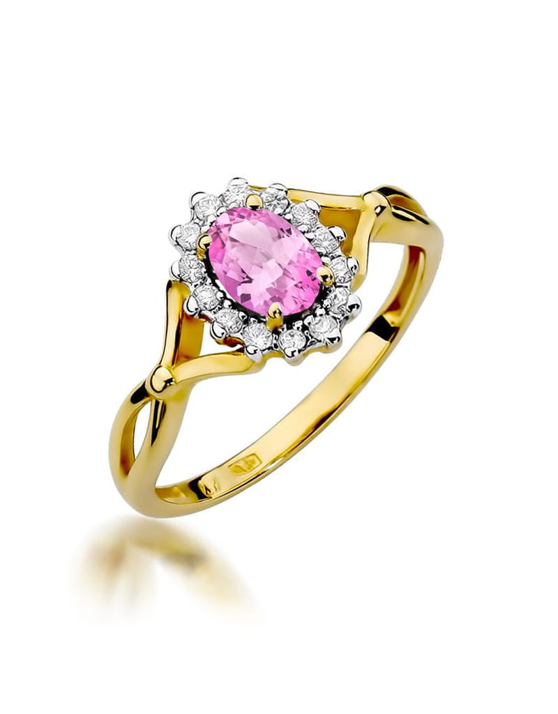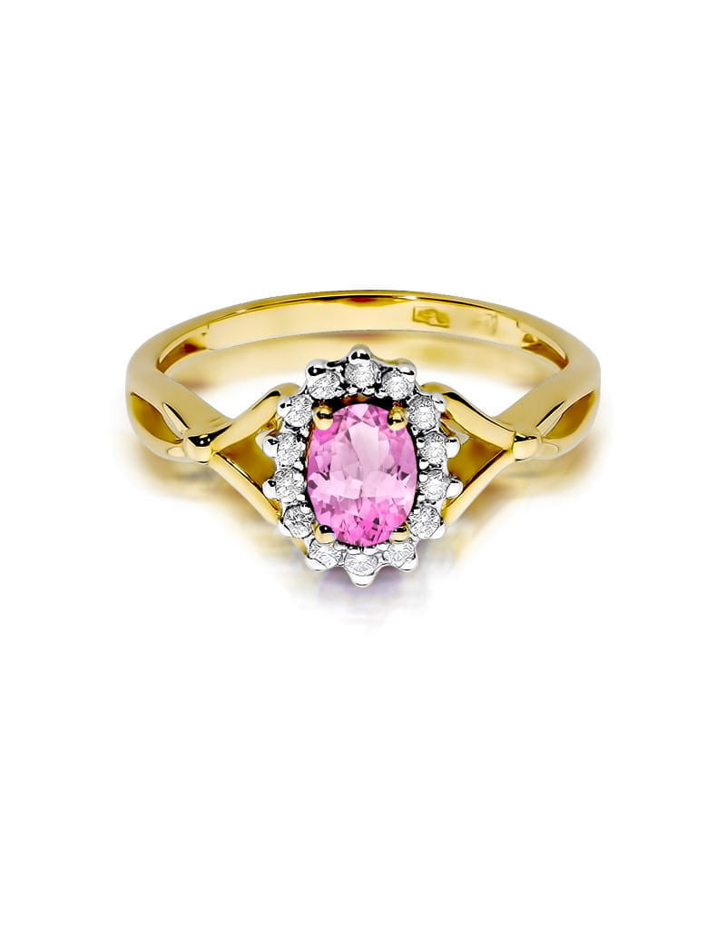 Godny podziwu pierścionek z żółtego złota z 14 brylantami dookoła zachwycającego różowego szafiru.