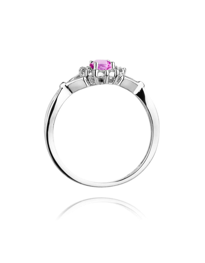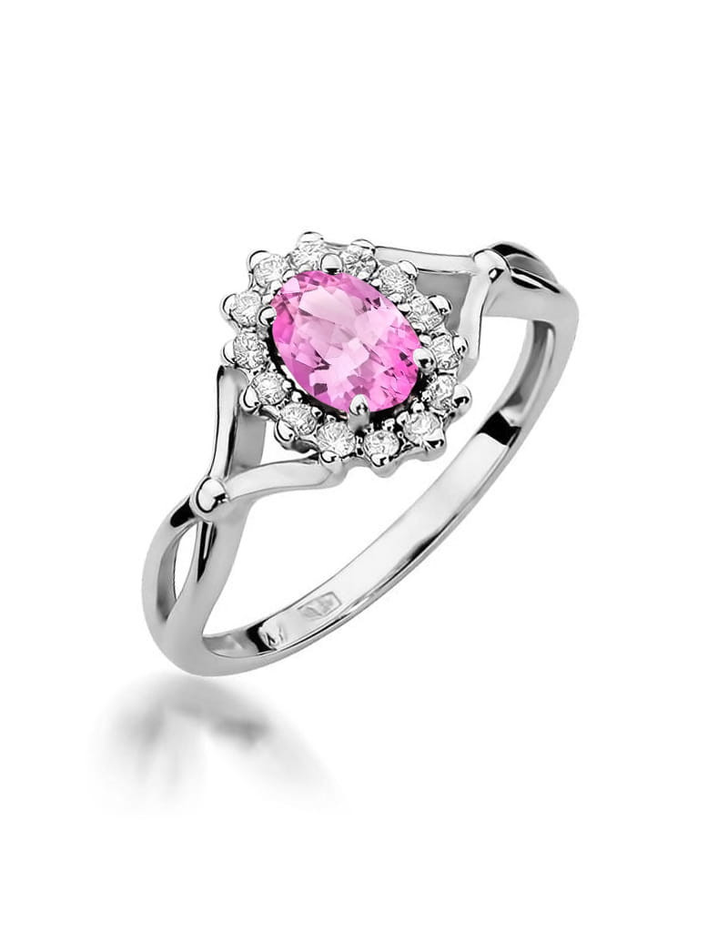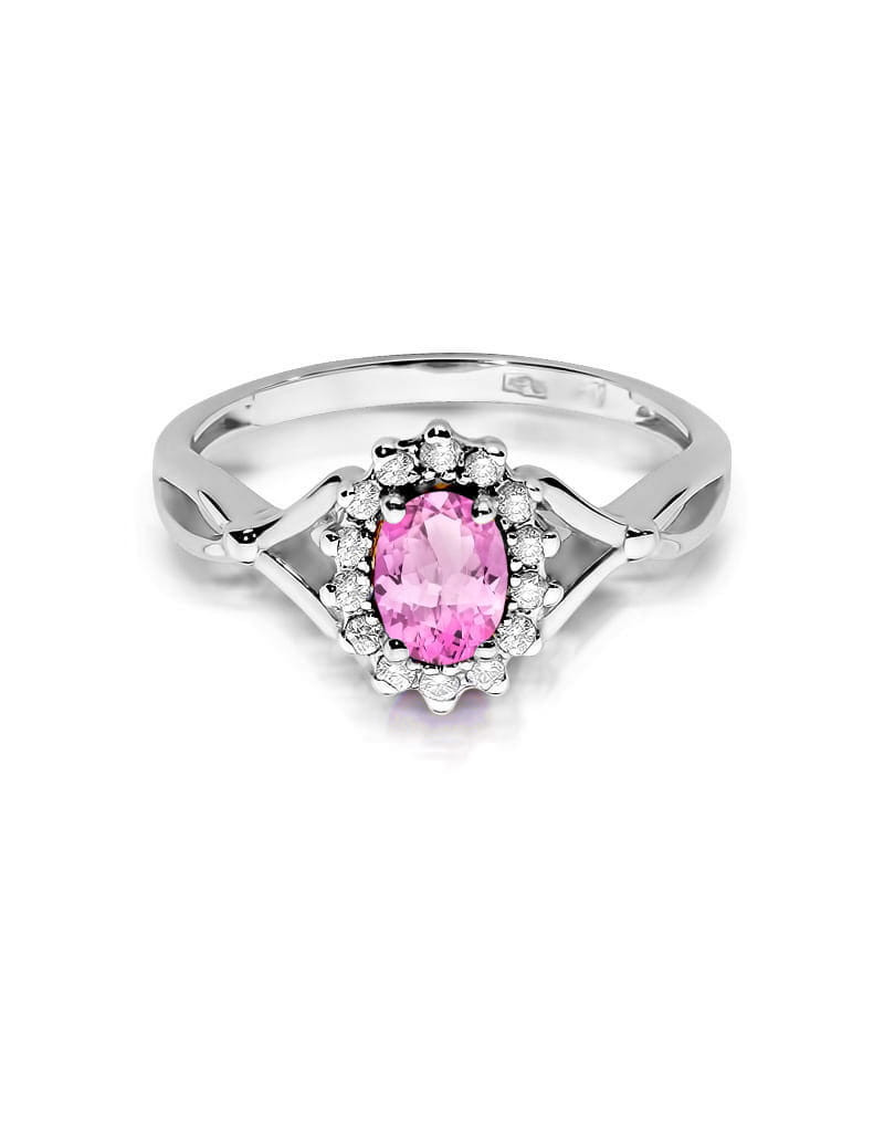 Godny podziwu pierścionek z białego złota z 14 brylantami dookoła zachwycającego różowego szafiru.