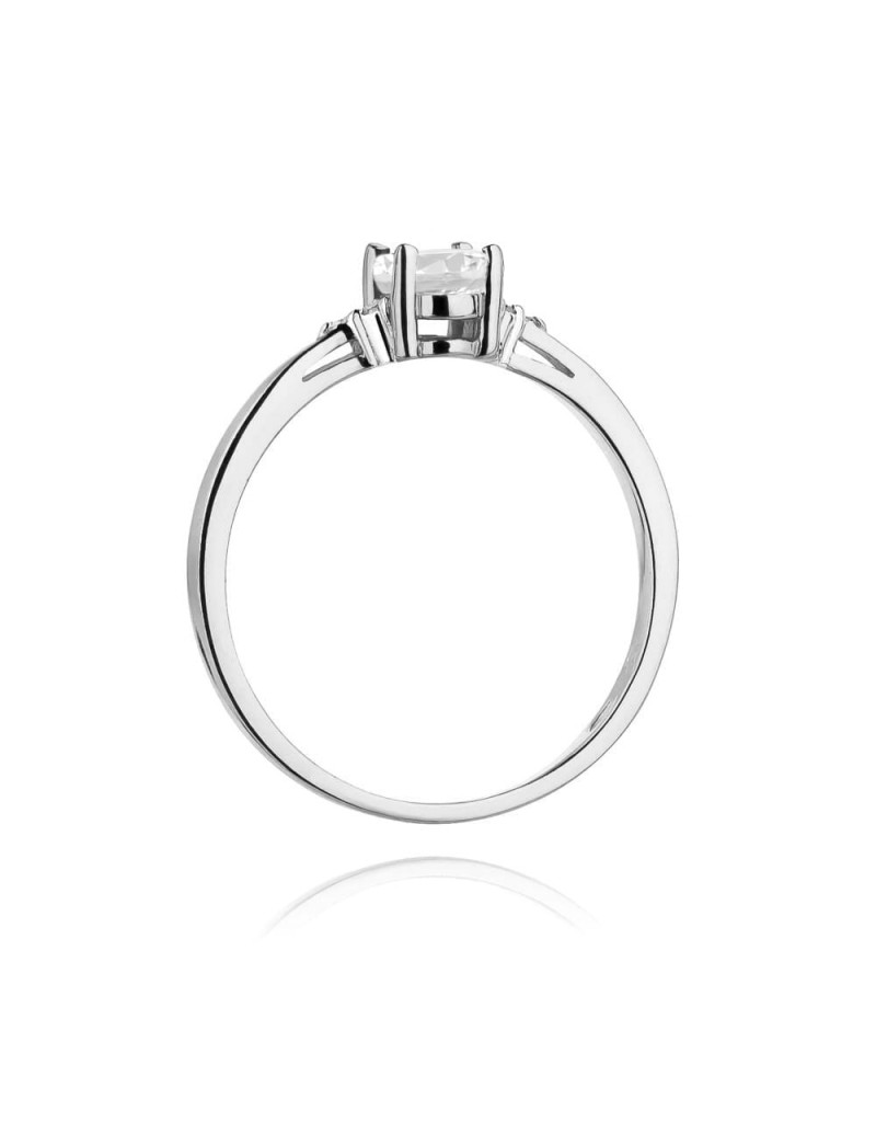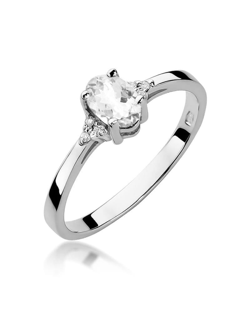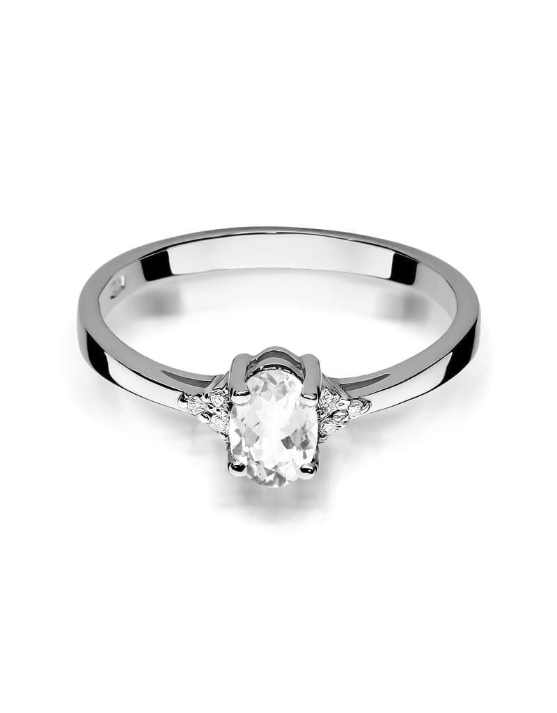 Urzekający pierścionek wykonany z białego złota z przepięknym białym szafirem oraz brylantami, które dodają mu blasku.