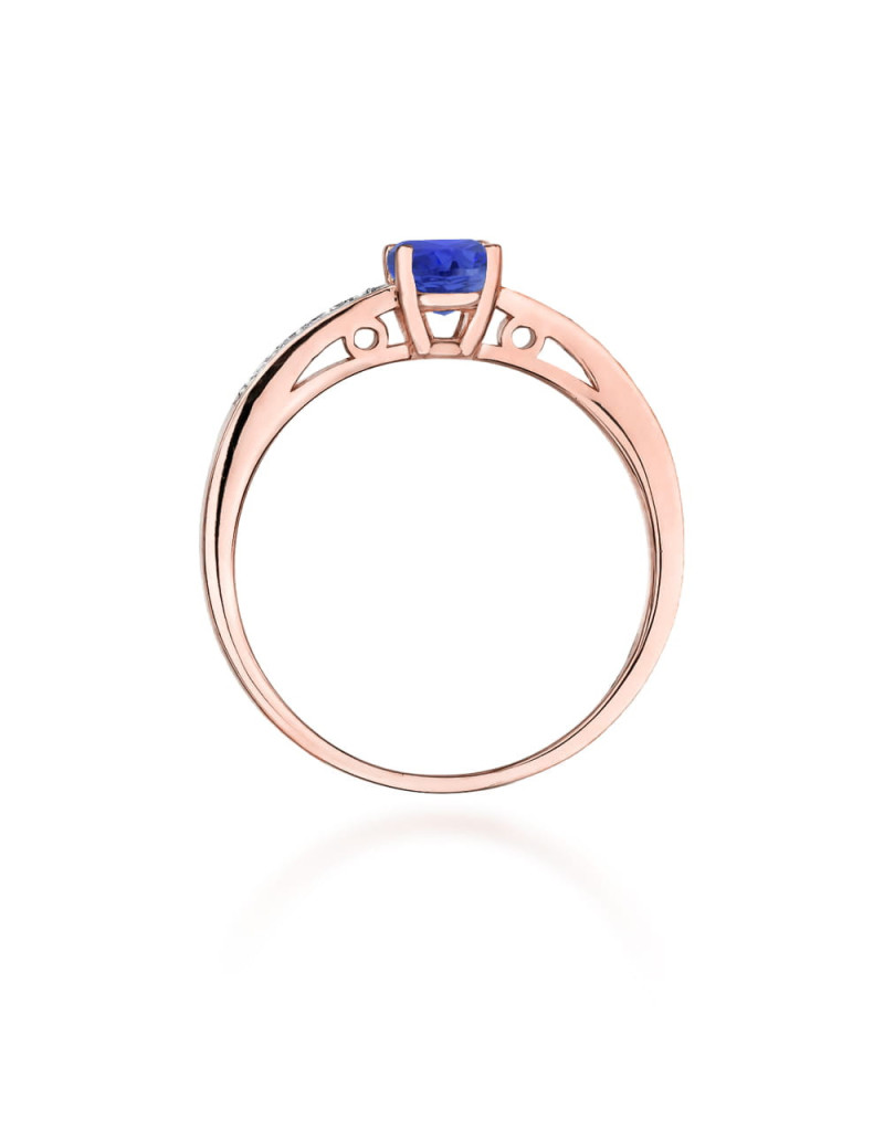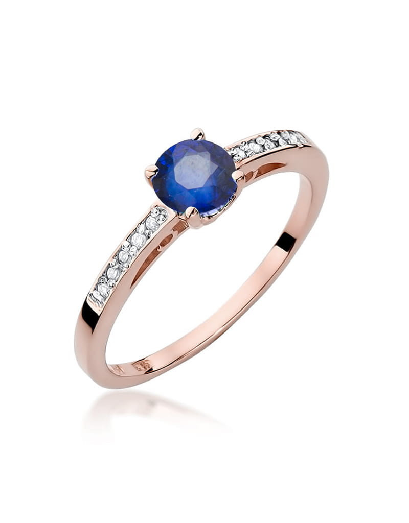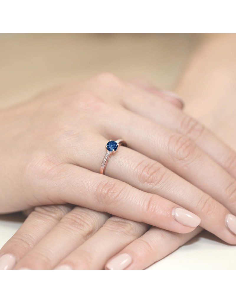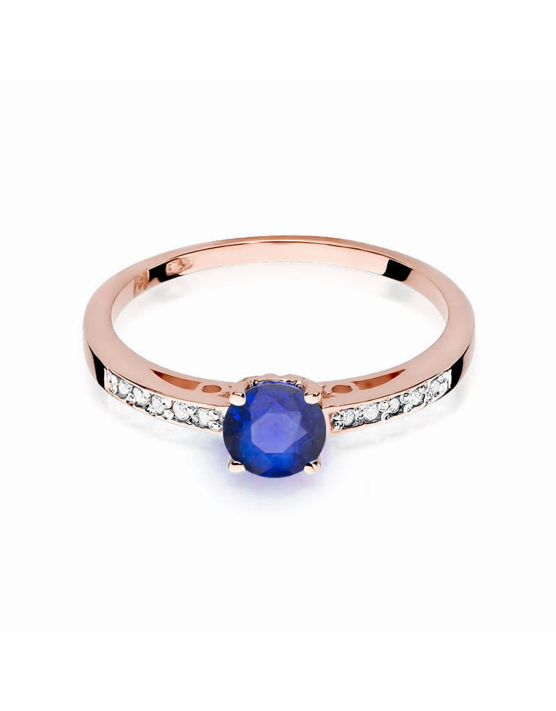 Uroczy pierścionek z różowego złota z okrągłym szafirem w czteroramiennej koronie oraz lśniącymi brylantami.