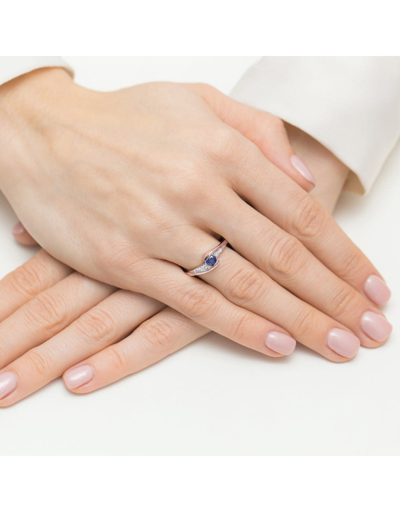 Bajeczny pierścionek wykonany z białego złota z przepięknym szafirem oraz lśniącymi brylantami w eleganckiej oprawie.