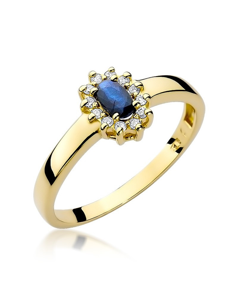Nietuzinkowy pierścionek z żółtego złota w eleganckim stylu z przepięknym szafirem i brylantami.