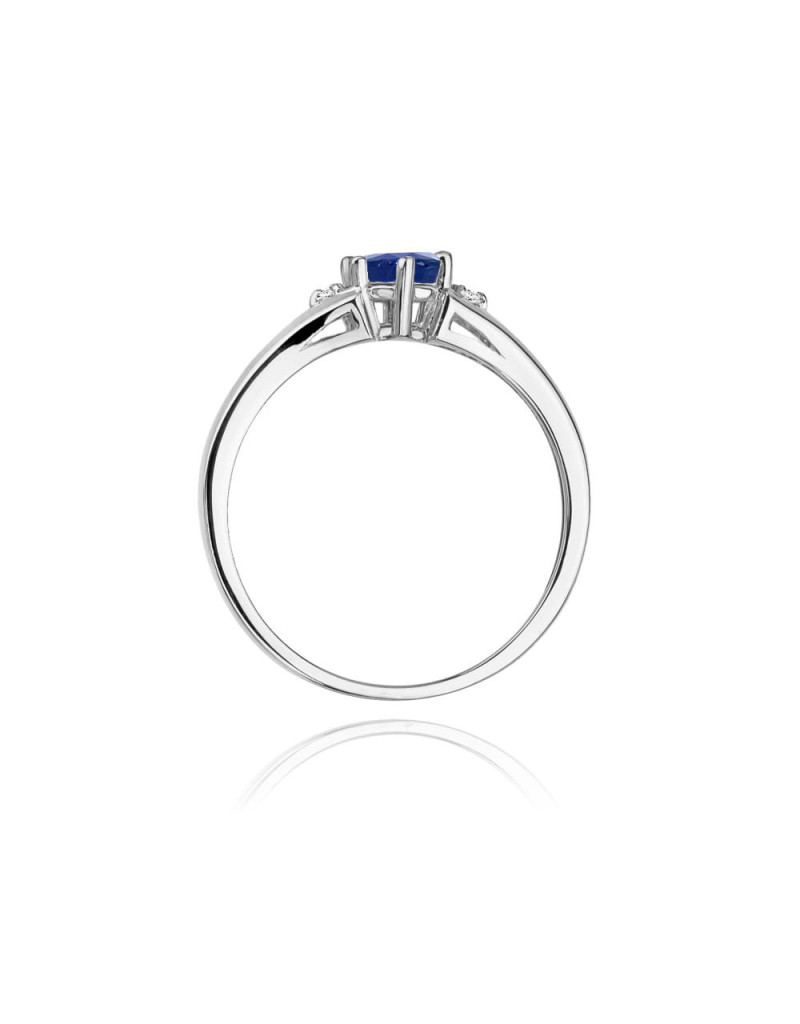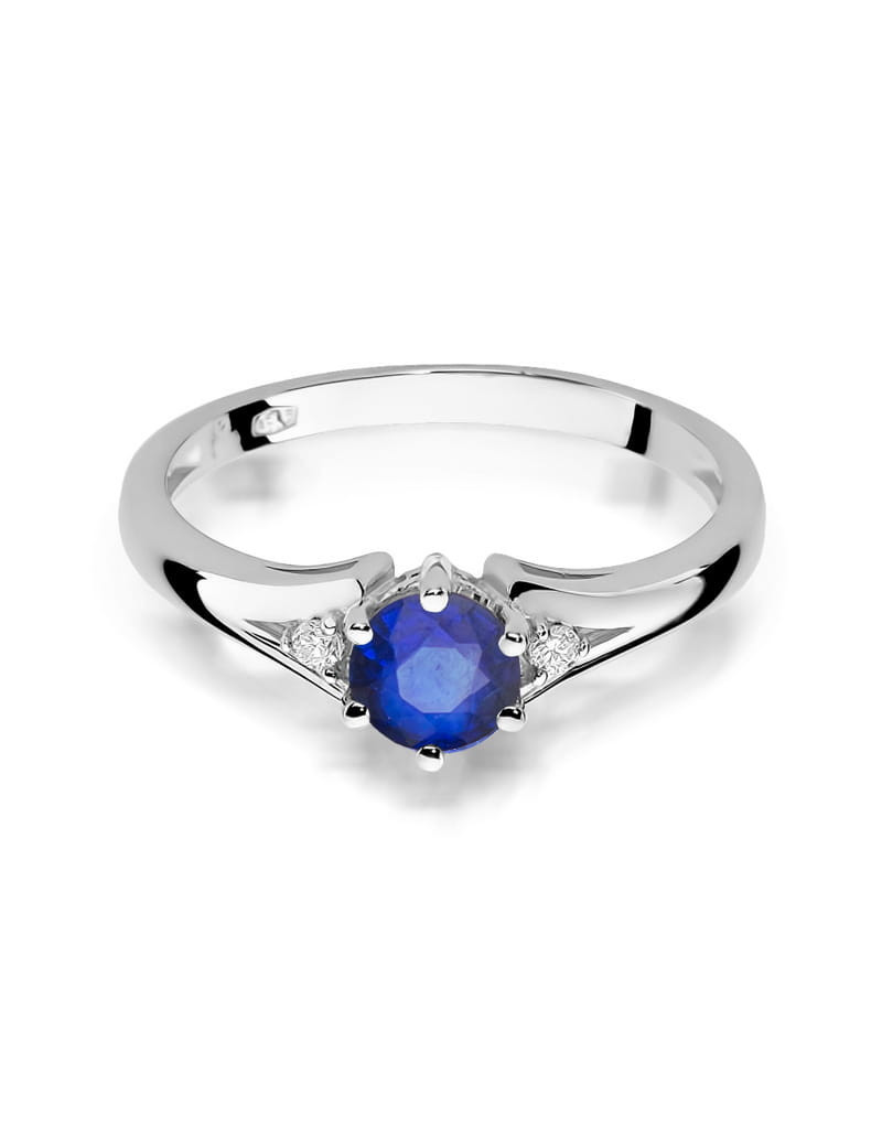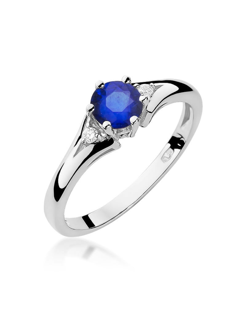Zjawiskowy pierścionek z białego złota z okrągłym szafirem i brylantami.