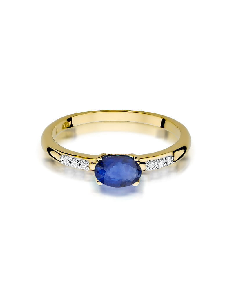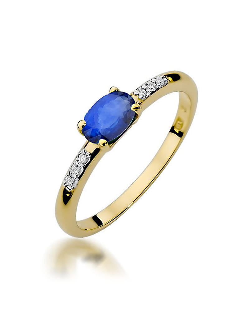 Bajeczny pierścionek wykonany z żółtego złota z przepięknym szafirem oraz lśniącymi brylantami w eleganckiej oprawie.