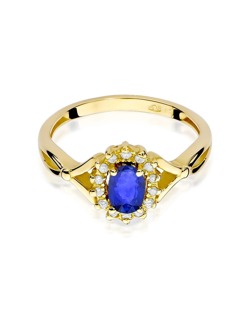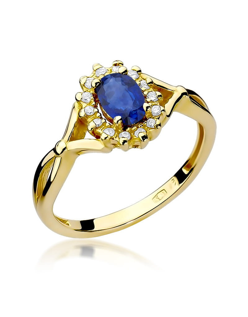 Godny podziwu pierścionek z żółtego złota z 14 brylantami dookoła zachwycającego szafiru.