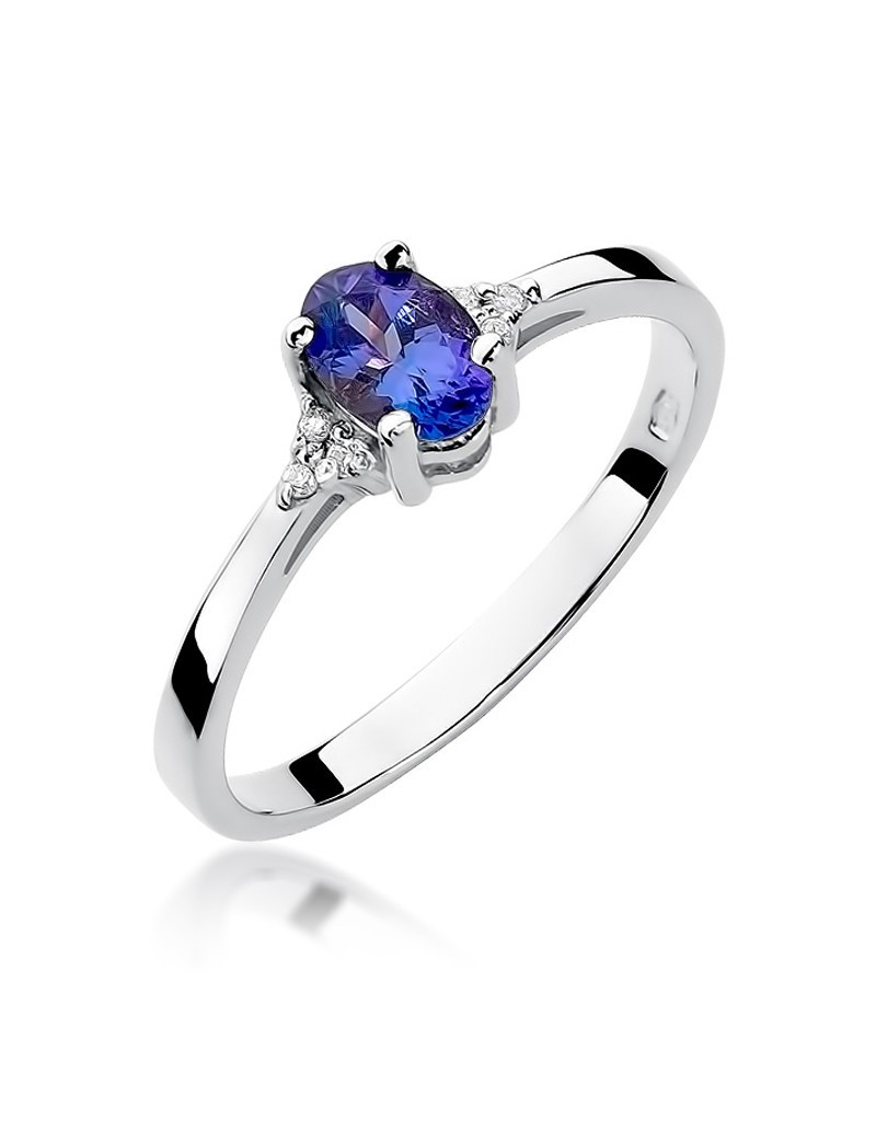 Urzekający pierścionek wykonany z białego złota z przepięknym szafirem, oraz brylantami które dodają mu blasku.