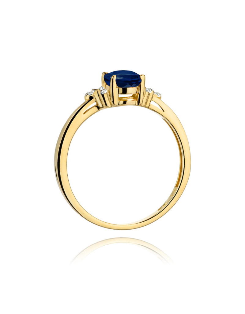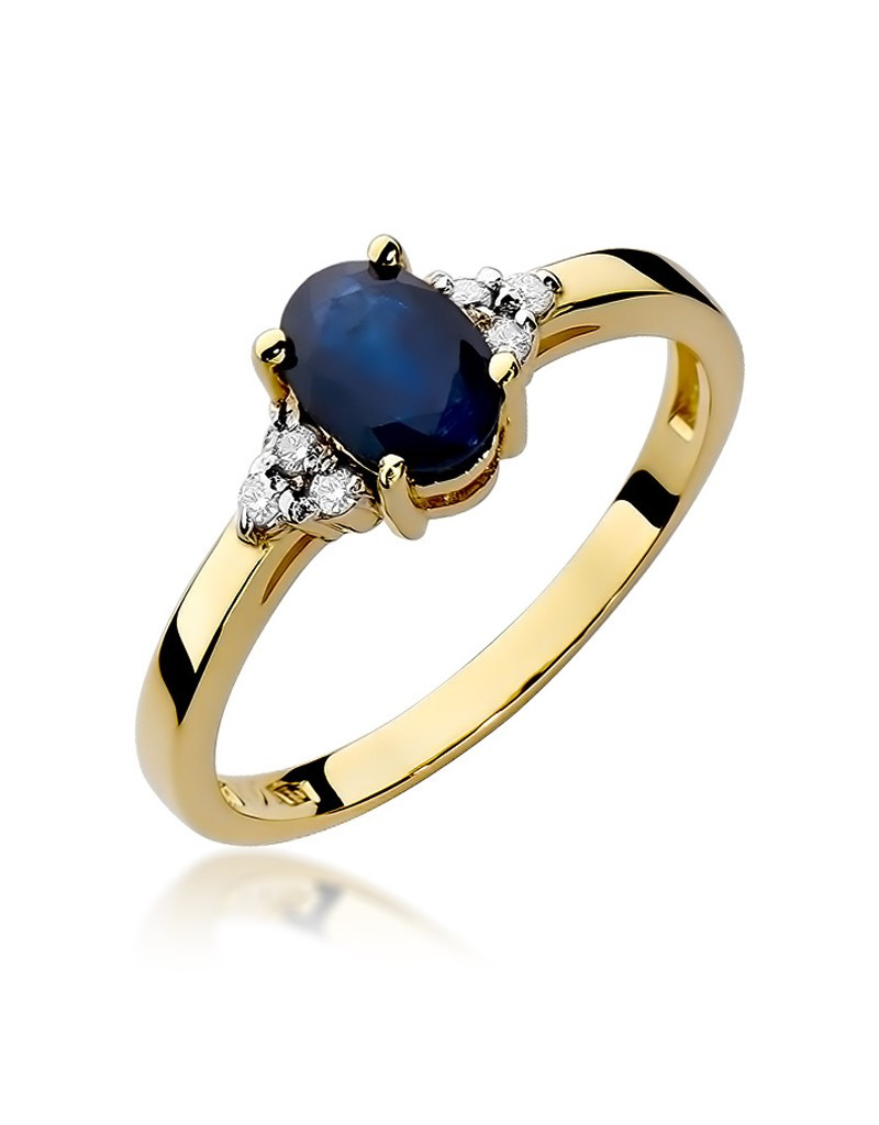 Luksusowy pierścionek z żółtego złota z owalnym szafirem w wyjątkowej oprawie z 6 brylantami.