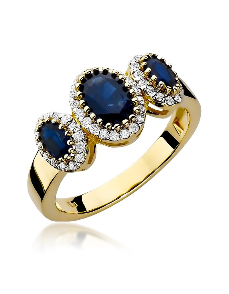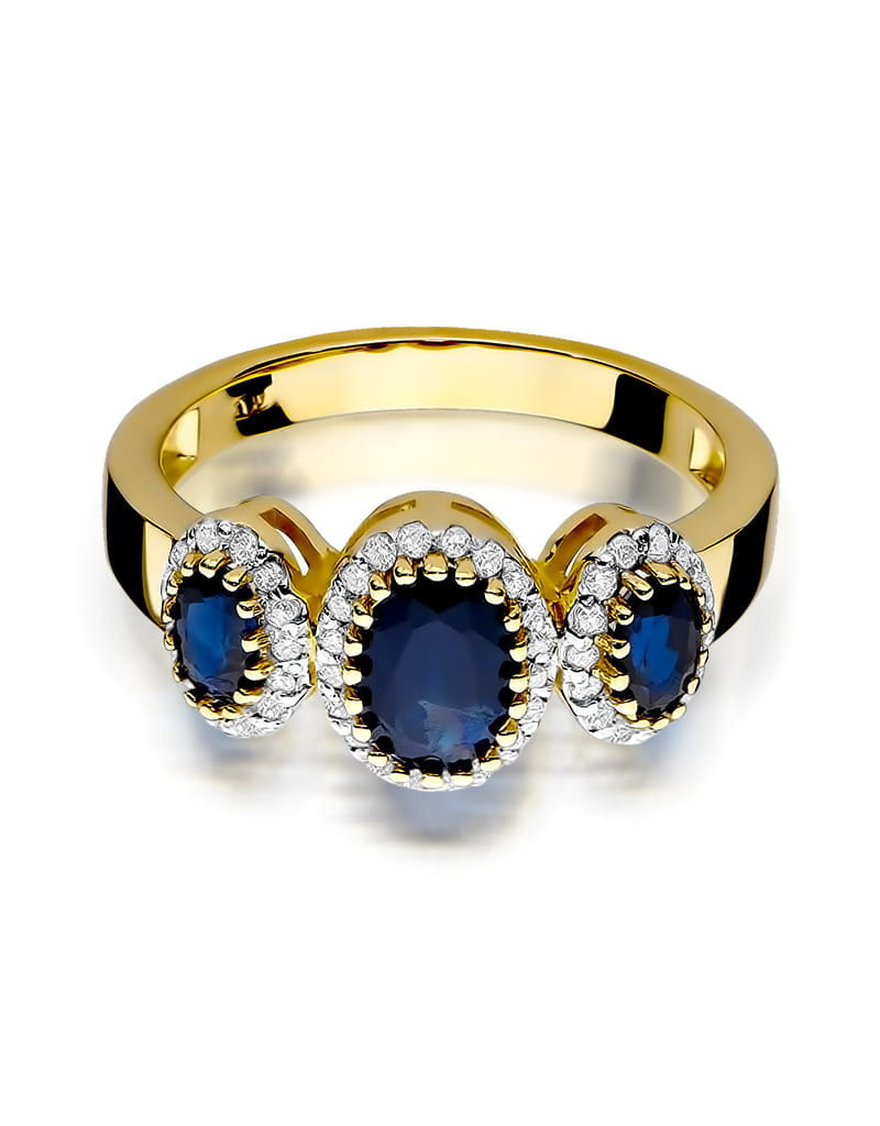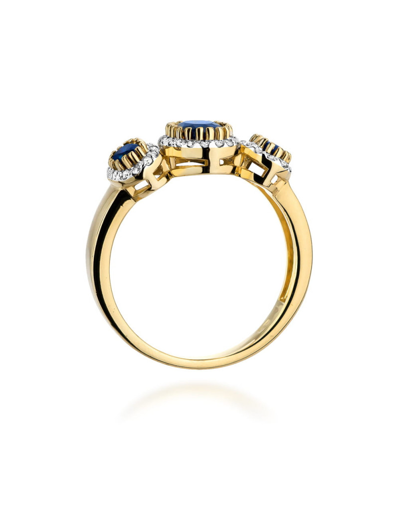 Pełen uroku pierścionek w stylu Retro, wykonany z żółtego złota w zjawiskowej formie z 3 szafirami ozdobionymi brylantami.