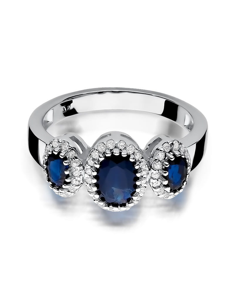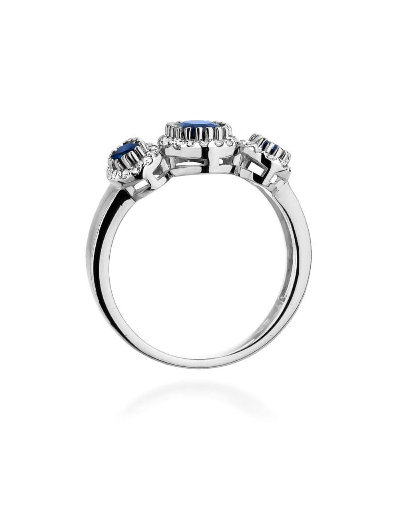 Pełen uroku pierścionek w stylu Retro, wykonany z białego złota w zjawiskowej formie z 3 szafirami ozdobionymi brylantami.