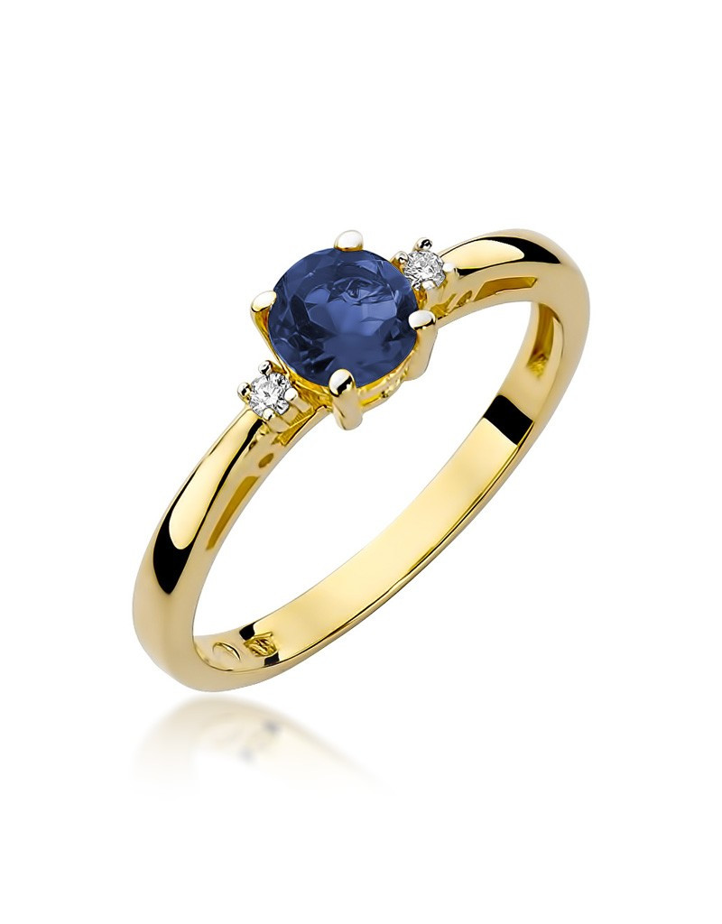 Pełen elegancji i klasyki pierścionek z żółtego złota z szafirem i 2 brylantami w czteroramiennej koronie.