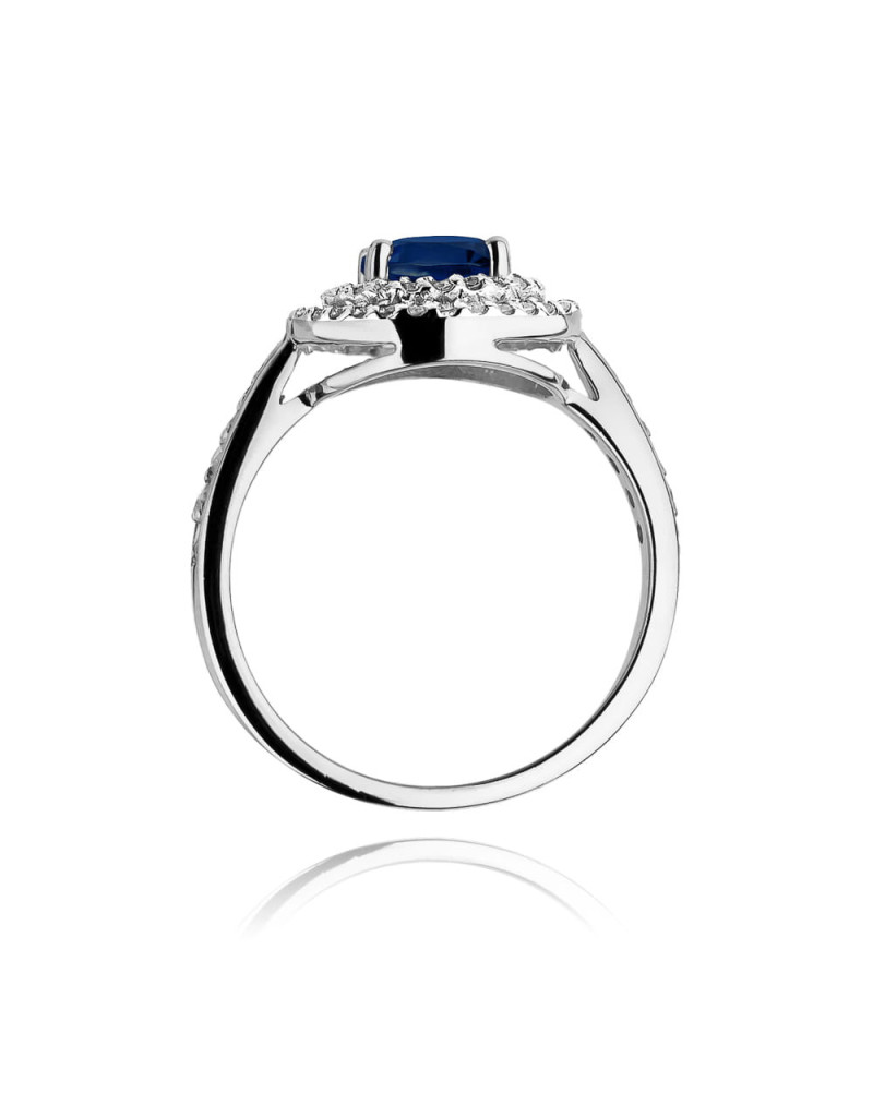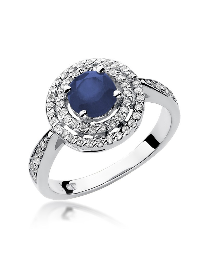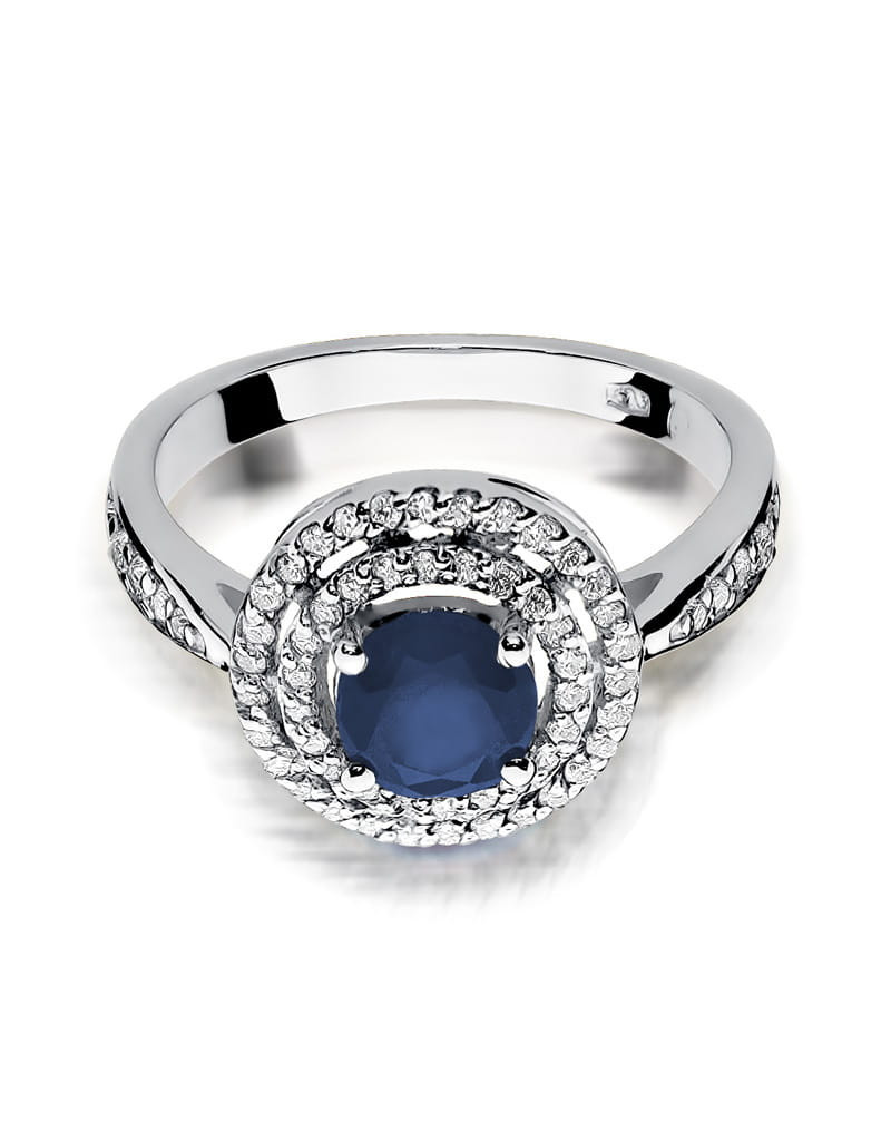 Pełen uroku pierścionek wykonany z białego złota ze zjawiskowym szafirem i 62 brylantami które dodają mu blasku.