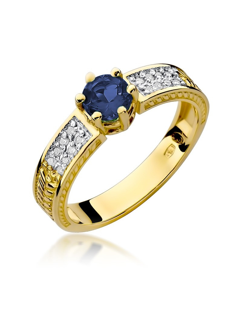 Ponadczasowy pierścionek z żółtego złota z przepięknym szafirem i lśniącymi brylantami na szynie, które dodają mu blasku.