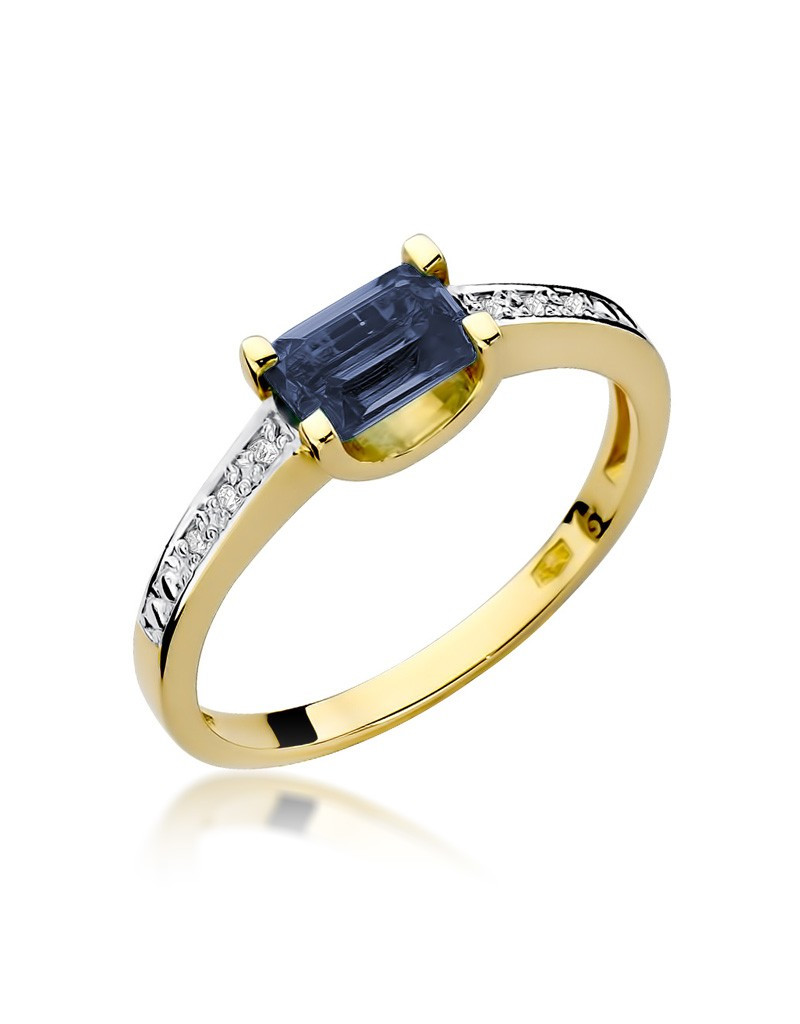 Oryginalny złoty pierścionek z niebiańskim szafirem oraz brylantami, które dodają mu blasku.