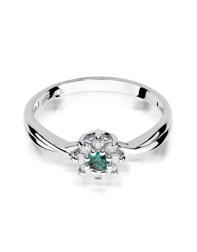 Pełen uroku pierścionek z białego złota ze szlachetnym szmaradgemi lśniącymi brylantami w formie kwiatuszka.