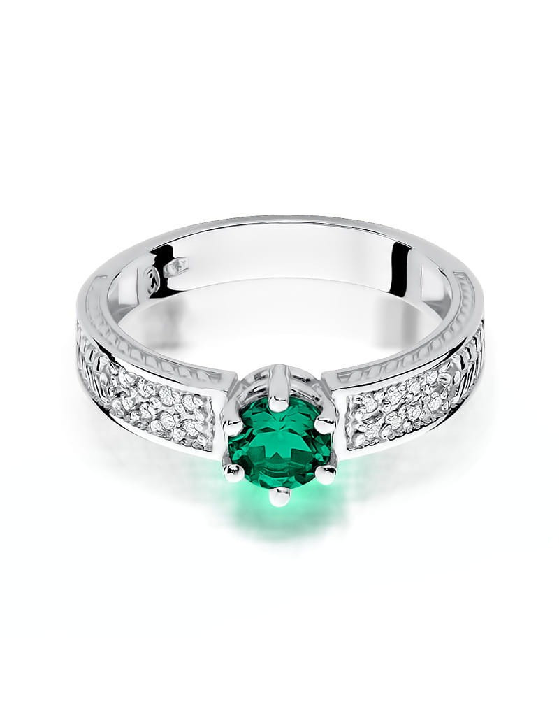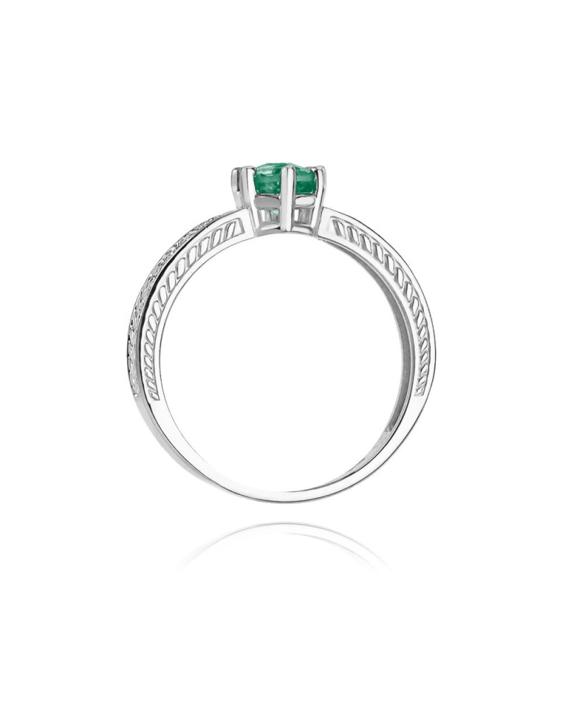 Ponadczasowy pierścionek z białego złota z urokliwym szmaragdem i lśniącymi brylantami na szynie, które dodają mu blasku.