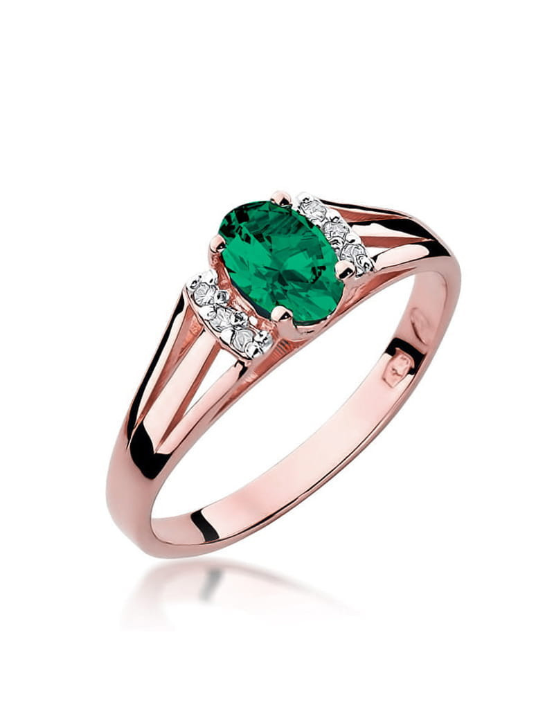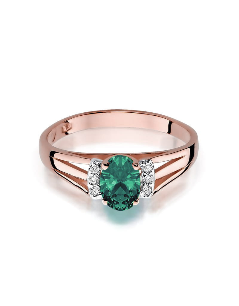 Doskonały wzór pierścionka z sześcioma brylantami, oraz niezwykłym owalnym szmaragdem. Wykonany z różowego złota.