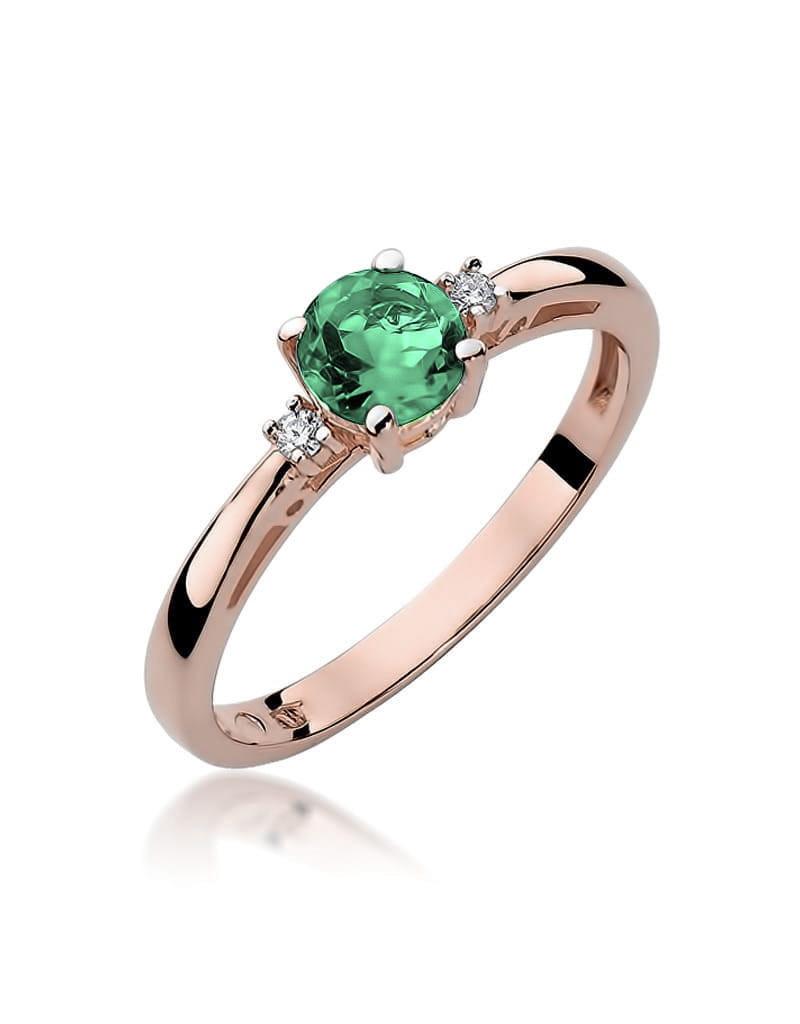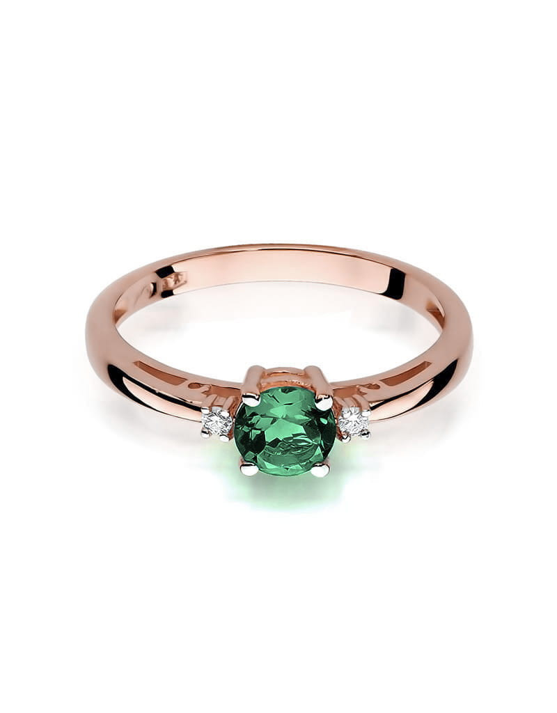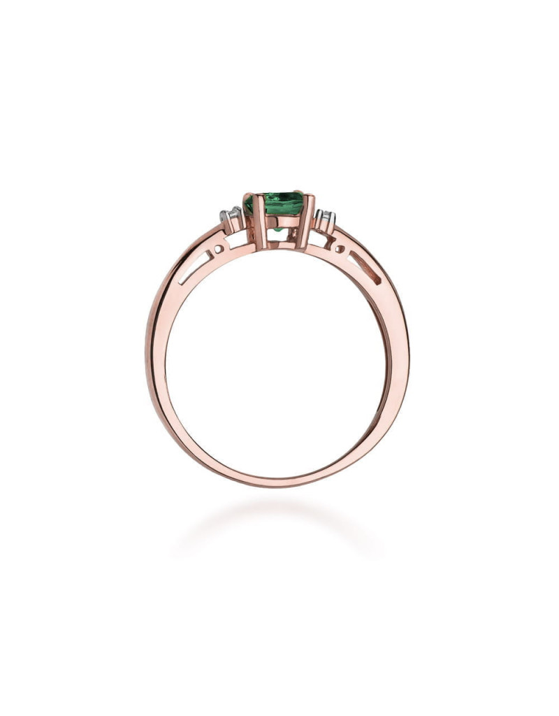 Pełen elegancji i klasyki pierścionek z różowego złota z szmaragdem i 2 brylantami w czteroramiennej koronie.