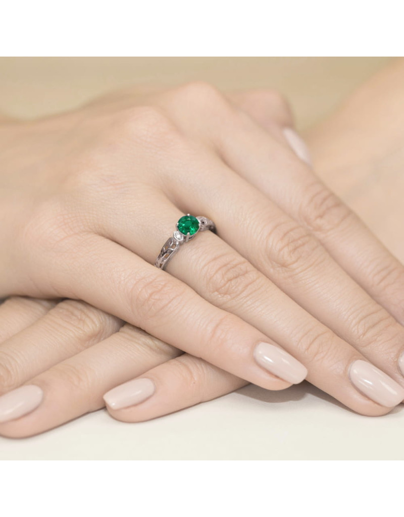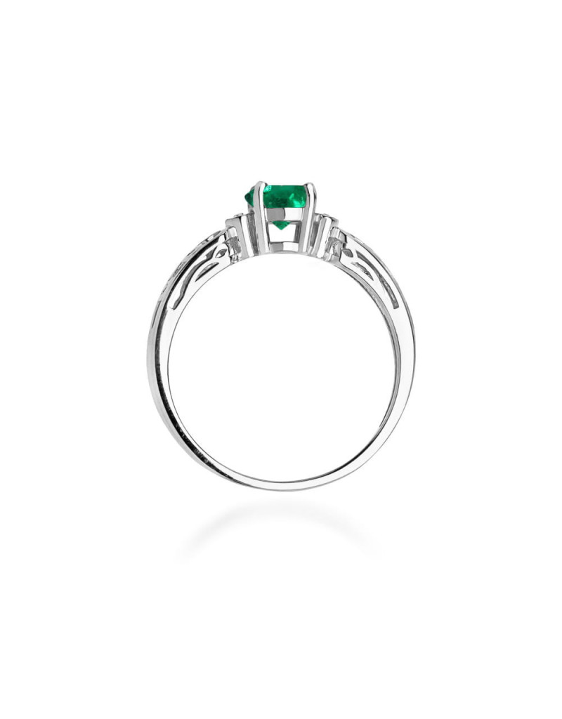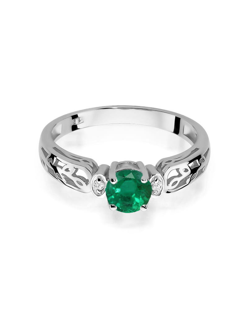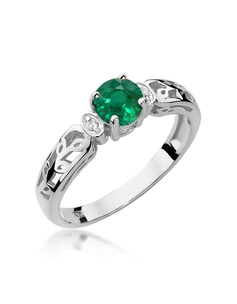 Pierścionek o finezyjnych kształtach z okrągłym szmaragdem w czteroramiennej koronie i brylantami.