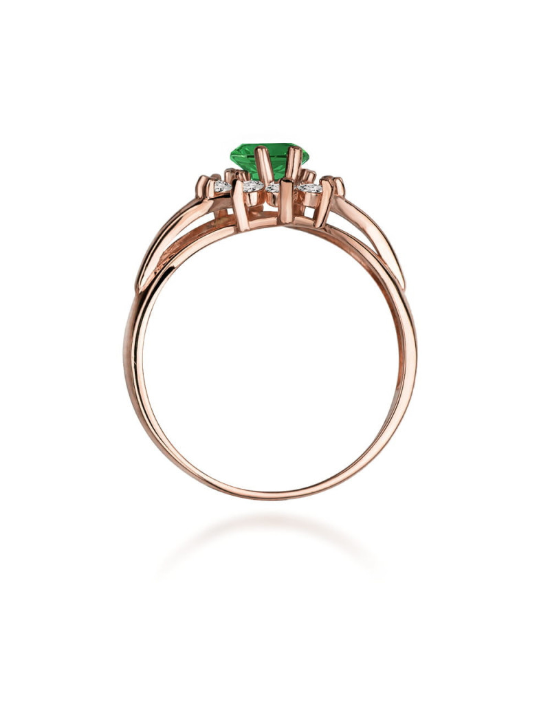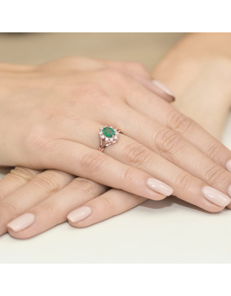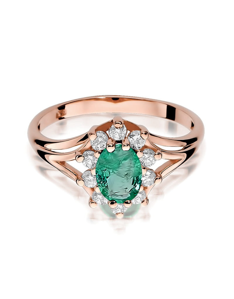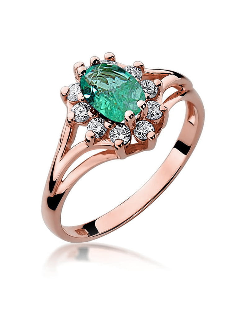 Luksusowy pierścionek z różowego złota z fascynującym szmaragdem oprawionym 10 brylantami.