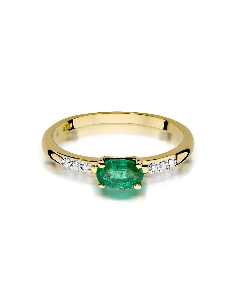 Bajeczny pierścionek wykonany z żółtego złota z przepięknym szmaragdem oraz lśniącymi brylantami w eleganckiej oprawie.
