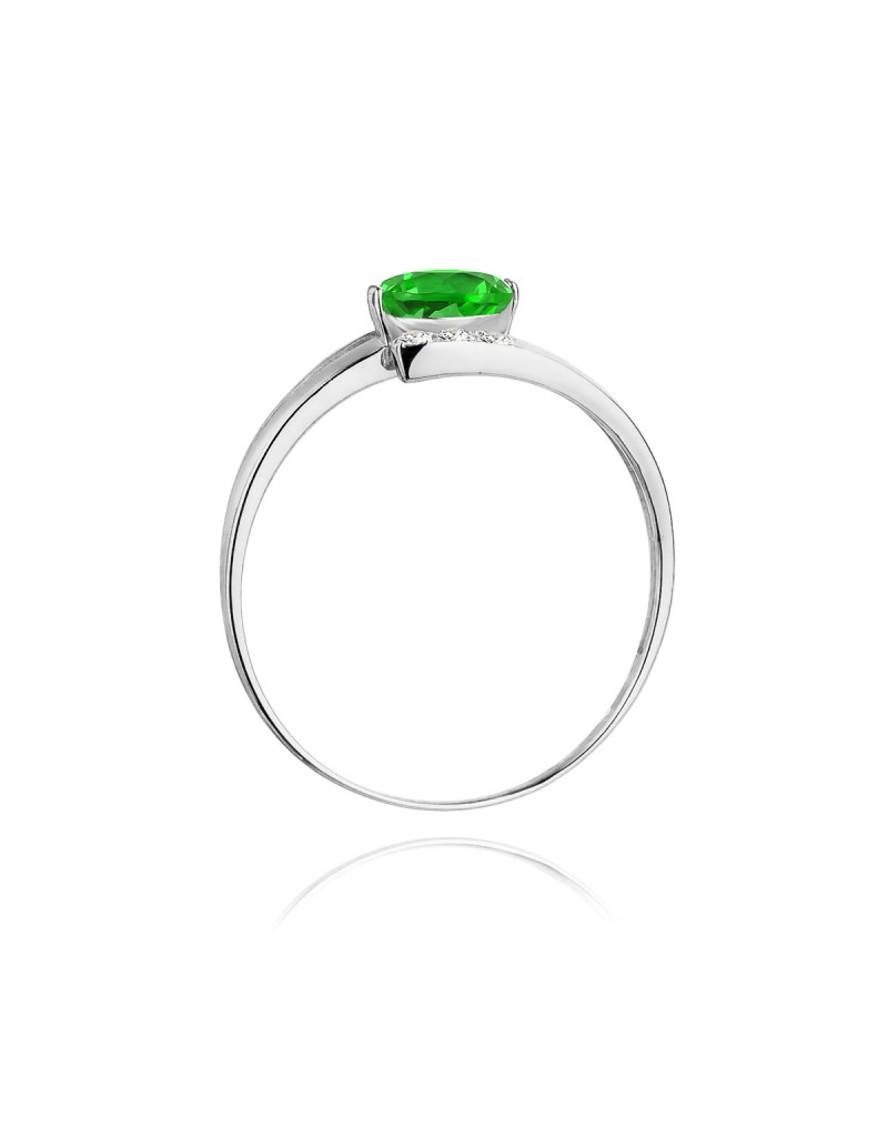 Bajeczny pierścionek z białego złota z owalnym szmaragdem, oraz lśniącymi brylantami osadzonymi na wygiętych szynach.