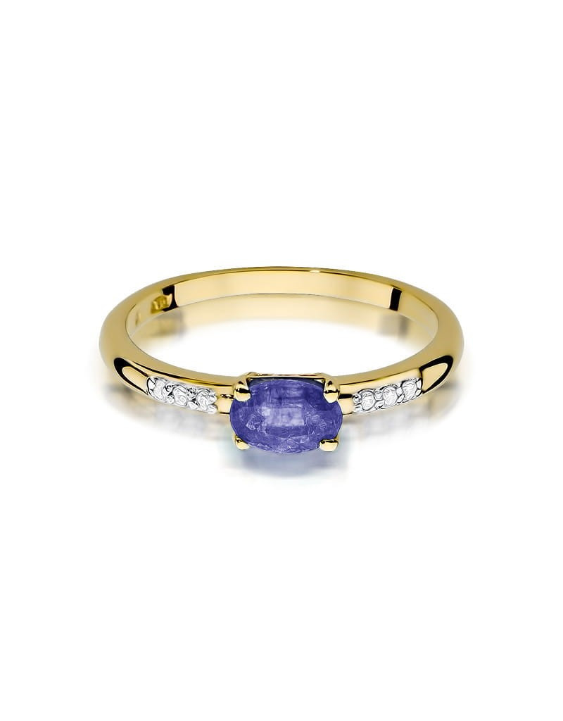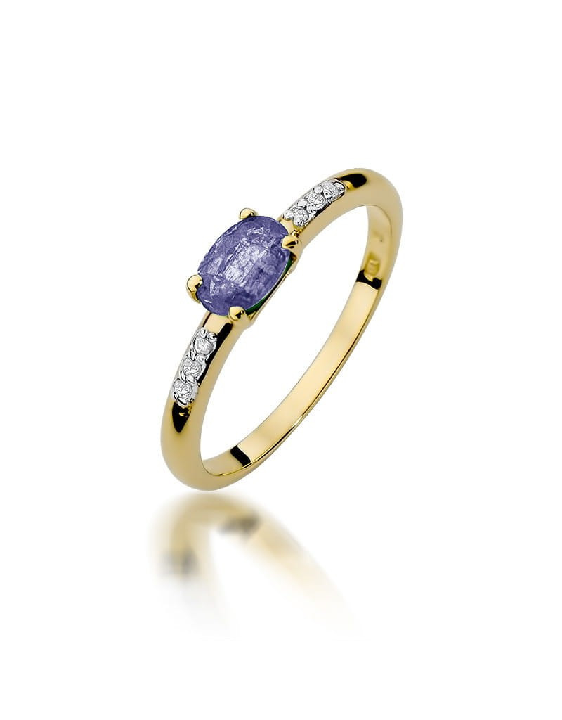 Bajeczny pierścionek wykonany z żółtego złota z przepięknym tanzanitem oraz lśniącymi brylantami w eleganckiej oprawie.