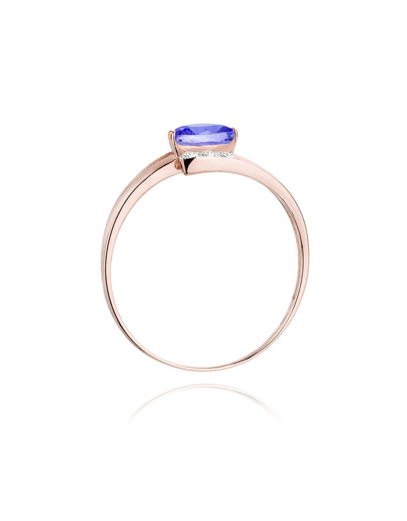 Bajeczny pierścionek z różowego złota z owalnym tanzanitem, oraz lśniącymi brylantami osadzonymi na wygiętych szynach.
