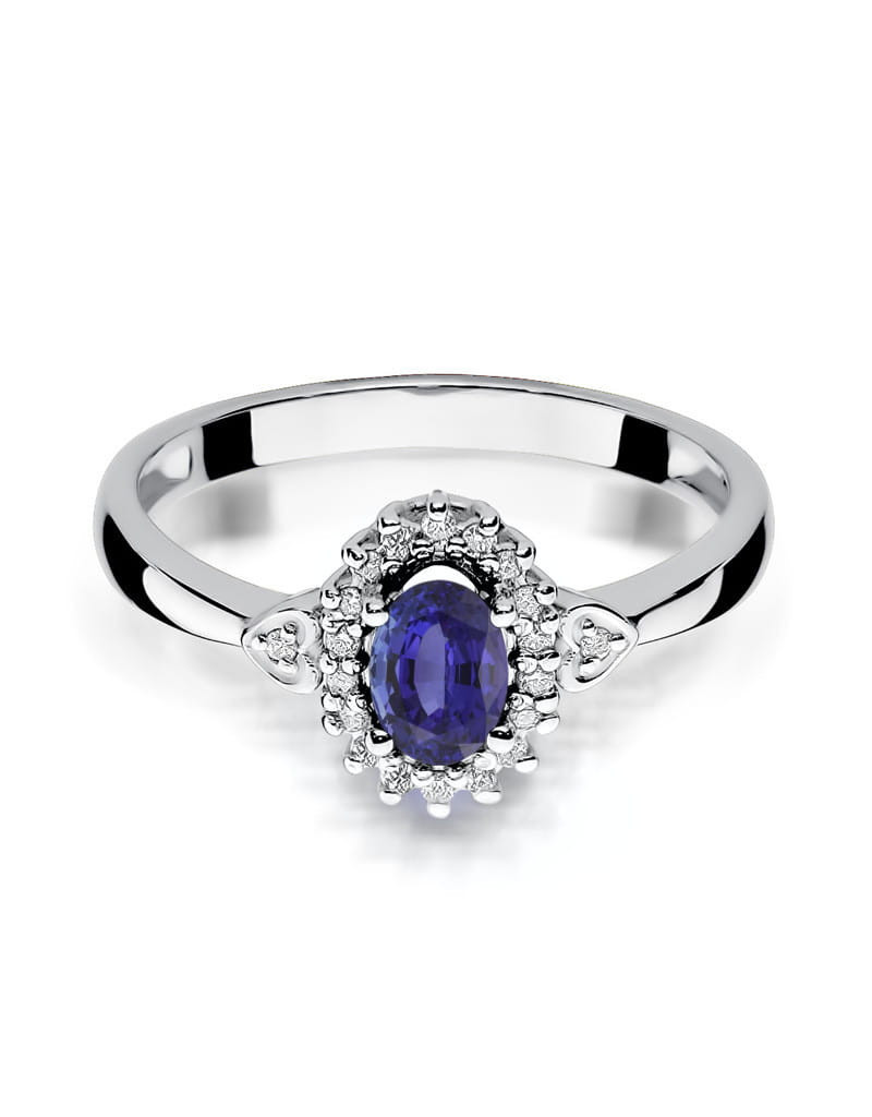 Ponadczasowy wzór złotego pierścionka z unikatowym tanzanitem w krystalicznej oprawie z 20 brylantami, oraz 2 subtelnymi serduszkami.