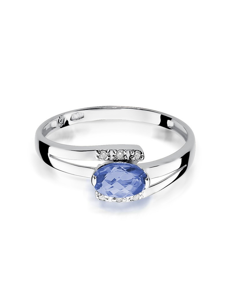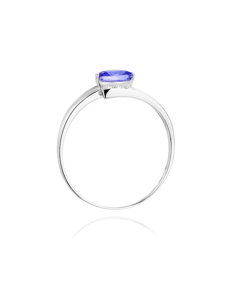 Bajeczny pierścionek z białego złota z owalnym tanzanitem, oraz lśniącymi brylantami osadzonymi na wygiętych szynach.