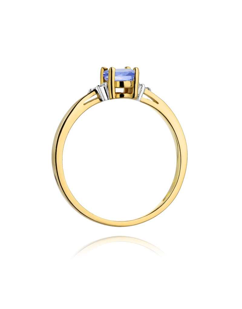 Urzekający pierścionek wykonany z żółtego złota z przepięknym tanzanitem, oraz brylantami które dodają mu blasku.