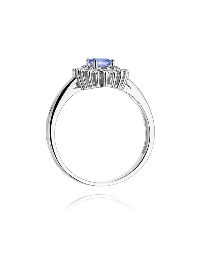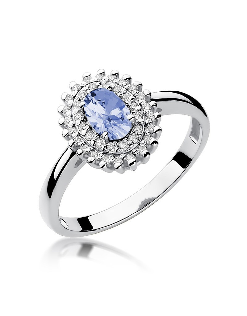 Ponadczasowy pierścionek z białego złota z fascynującym tanzanitem otoczonym 39 lśniącymi brylantami.