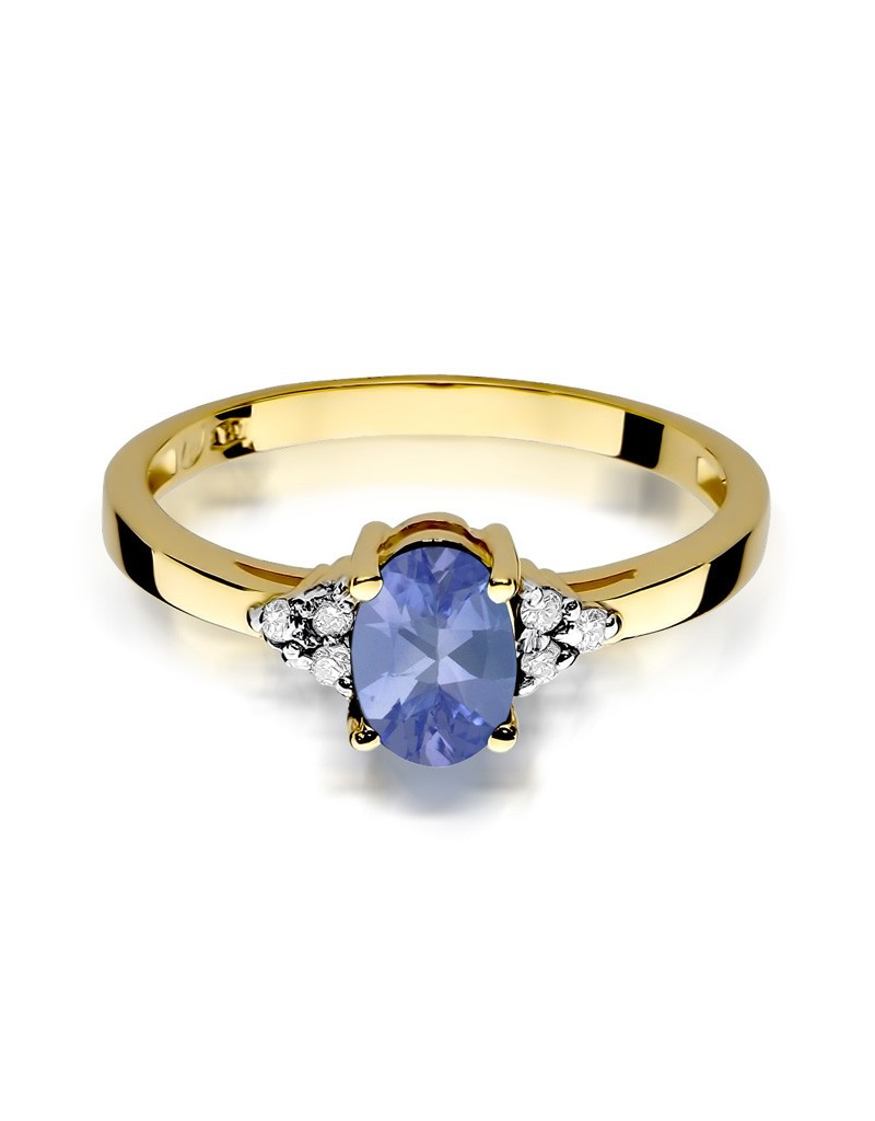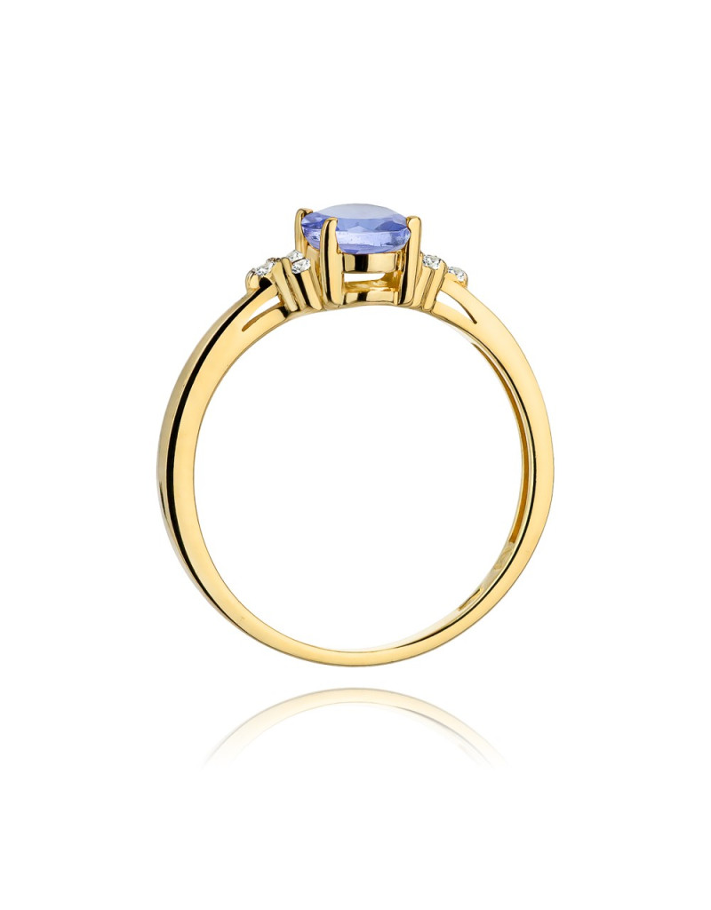 Luksusowy pierścionek z żółtego złota z owalnym tanzanitem w wyjątkowej oprawie z 6 brylantami.