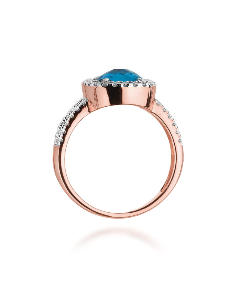 Nietuzinkowy pierścionek z różowego złota z czarującym topazem, osadzony 63 brylantami które dodają mu blasku i lśnienia.